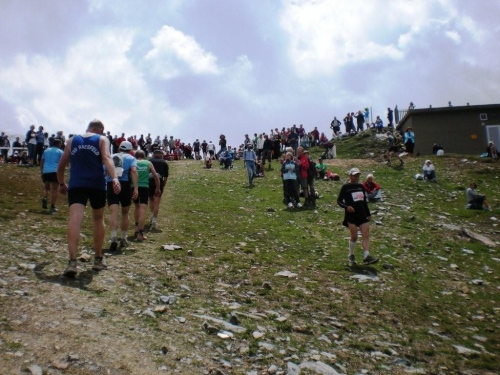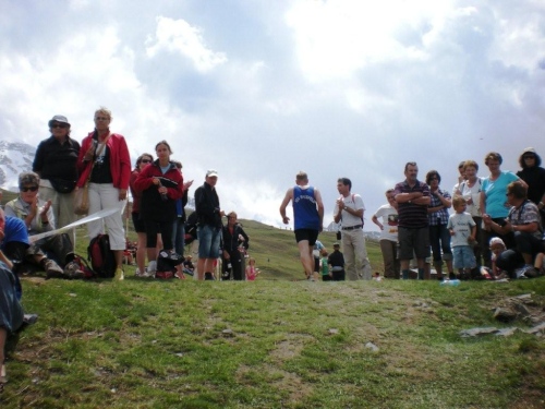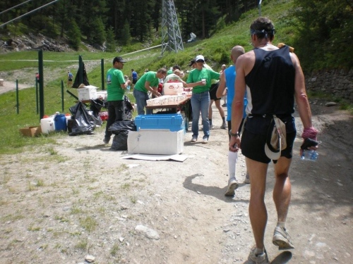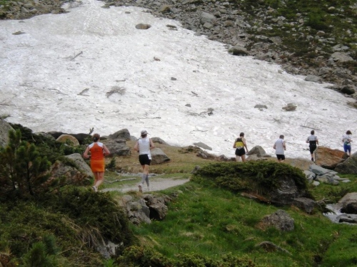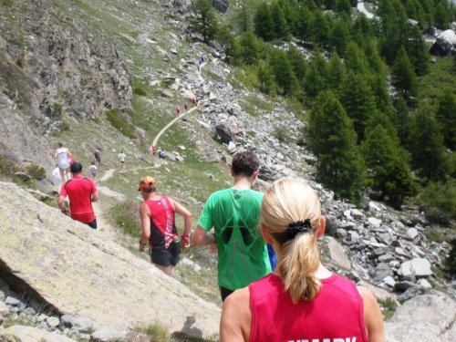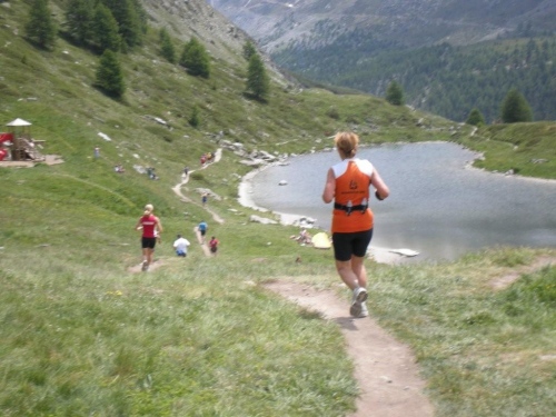 Jetzt gibt es „nur“ noch zwei Anstiege, der erste ist ein hochalpiner Trail, auf dem auch jetzt noch die Läufer dicht hintereinander folgen. Ich habe den Eindruck, den Teilnahmerekord auch daran erkennen zu können.