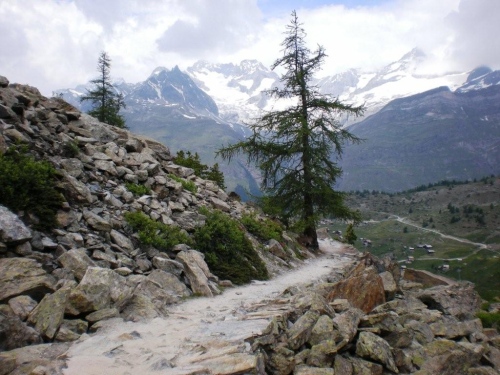 Über Gant geht es ein paar Kilometer auf einer mehrheitlich abfallenden Passage zur Riffelalp. Der Blick zwischen den Lärchen und Arven hindurch auf das Bergpanorama ist beeindruckend. Es ist ein stetes Abwägen, wo ich hinschauen soll, denn auf diesem Weg ist nichts zu wollen mit lockerem Sonntagsspaziergang. Da es mich in diesem Jahr schon einmal zünftig hingelegt hat und ich die Kamera in der Hand habe, opfere ich der Vorsicht ein Stückchen der möglichen Geschwindigkeit.