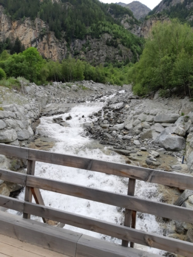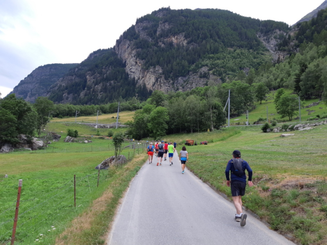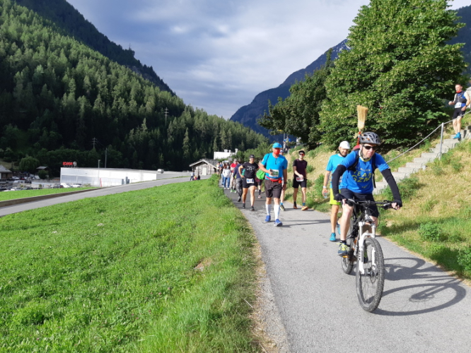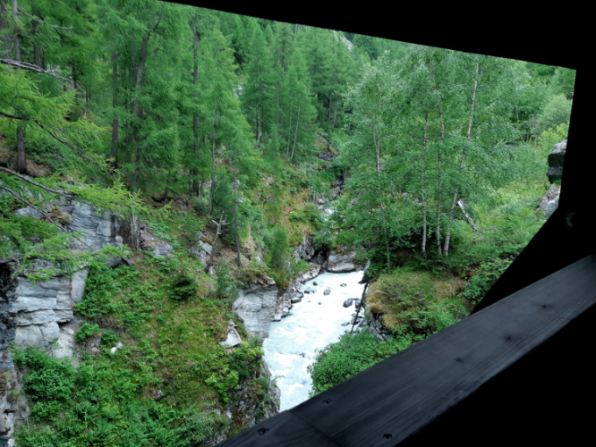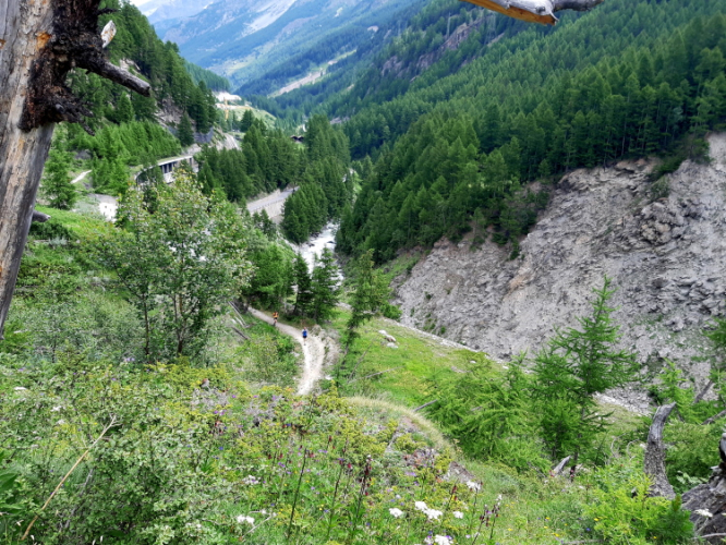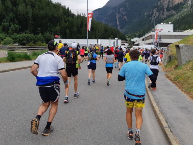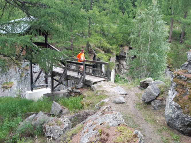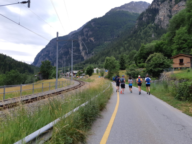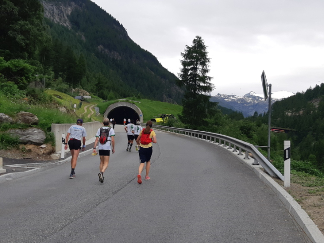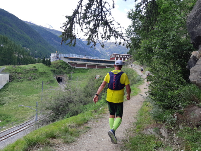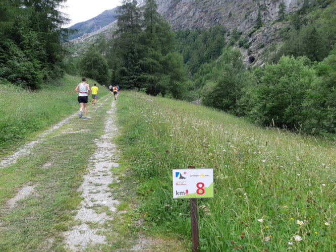 Hinter dem Ort folgen wir der für den allgemeinen Verkehr gesperrten Straße, denn Zermatt ist nicht nur am Marathontag autofrei. Wer nicht gleich mit der Bahn anreist, muss sein Auto im „Matterhorn Terminal Täsch“ stehen lassen und mit dem Bahn-Shuttle weiterfahren. Dergleichen Probleme haben wir nicht, denn wir „reisen“ zu Fuß und dürfen dabei sogar einen Straßentunnel nutzen. Schon einige Zeit geht es wieder aufwärts, daher bin ich froh, als wir von der Straße weg auf einen Trail geleitet werden, der uns auf dem „Hohsteg“ die Mattervispa überqueren lässt.