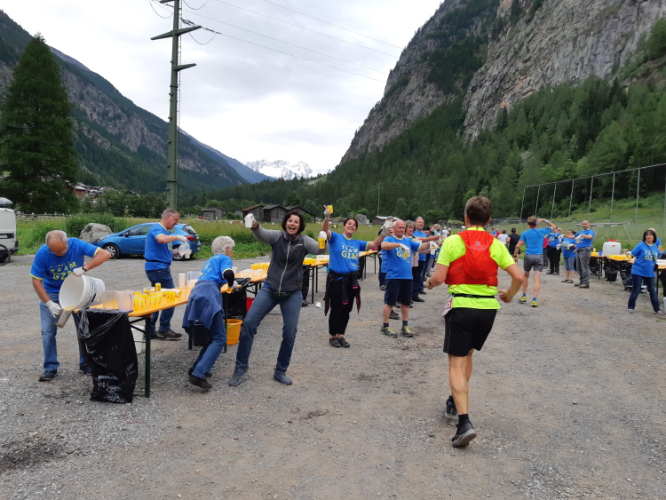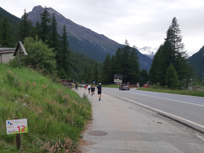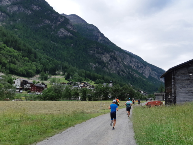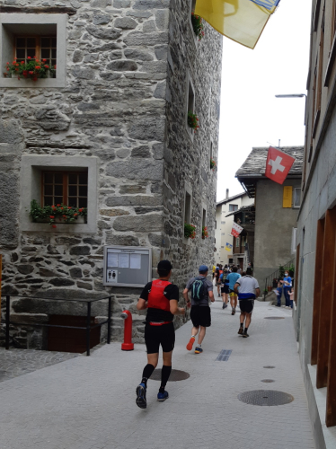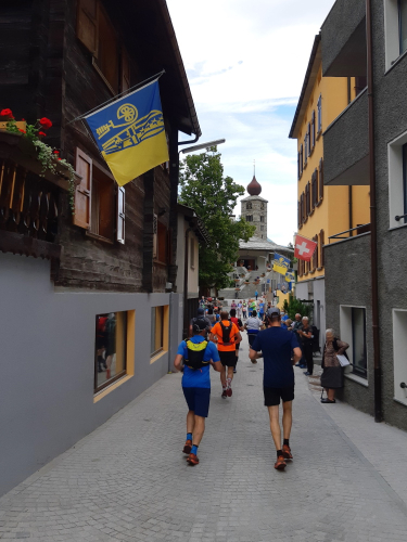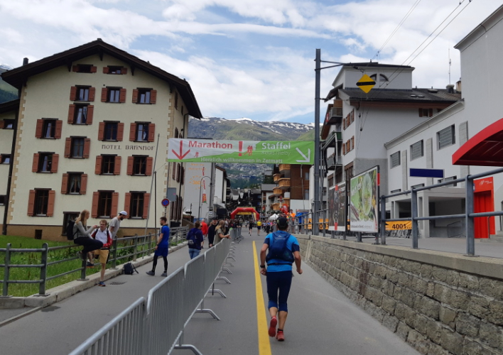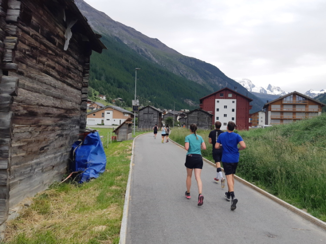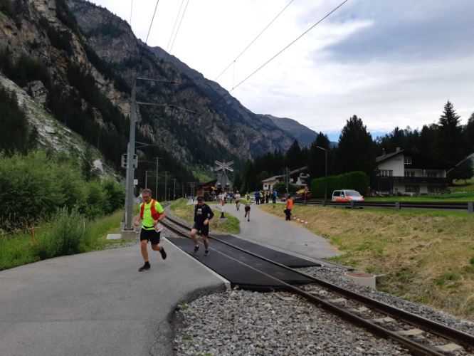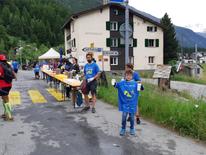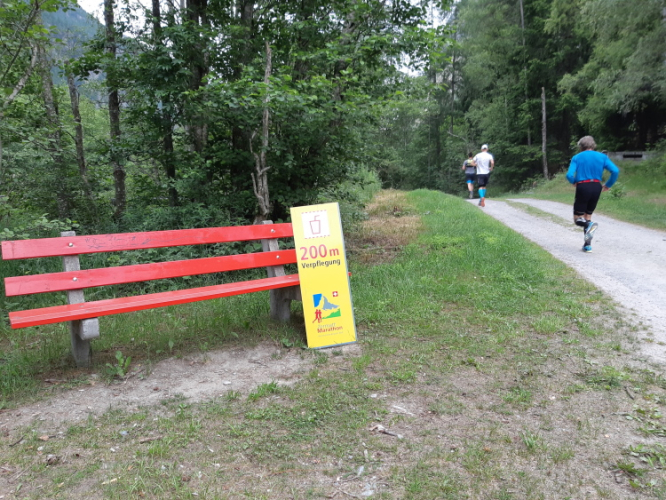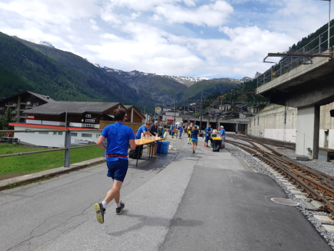 In Randa folgt im Dorfkern die zweite Verpflegung, danach schließt sich bis Täsch ein weiterer flacher, asphaltierter Abschnitt an, ein kurzes Stück müssen wir direkt entlang der Kantonstraße laufen, der einzige eher langweilige Abschnitt der Strecke. In Täsch erreichen wir bei km 14 die nächste Verpflegungsstelle, die sich hier sehr üppig auf gleich drei Bereiche aufteilen.