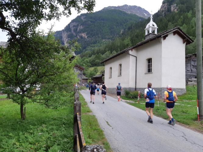 Auffallend ist auch das Luxushotel Zermatterhof. Wohltuend bescheiden wirkt dagegen das Hotel Monte Rosa, mit dem Alexander Seiler 1839 den Tourismus in Zermatt begründete. Dann verlassen wir den Ortskern und laufen an der Mattervispa weiter Richtung Gornerschlucht, in der der Fluss, der hier seinen Namen in Gornervispa oder Gornera ändert, eine Klamm gefressen hat. Vor der Schlucht kehren wir allerdings um und laufen auf der anderen Seite des Flusses zurück. Nach einem kurzen Begegnungsstück und einer weiteren Verpflegung beginnt nun in Zermatt bei km 24,5 die Rampe zur Sunnega.