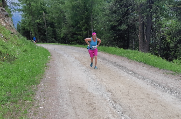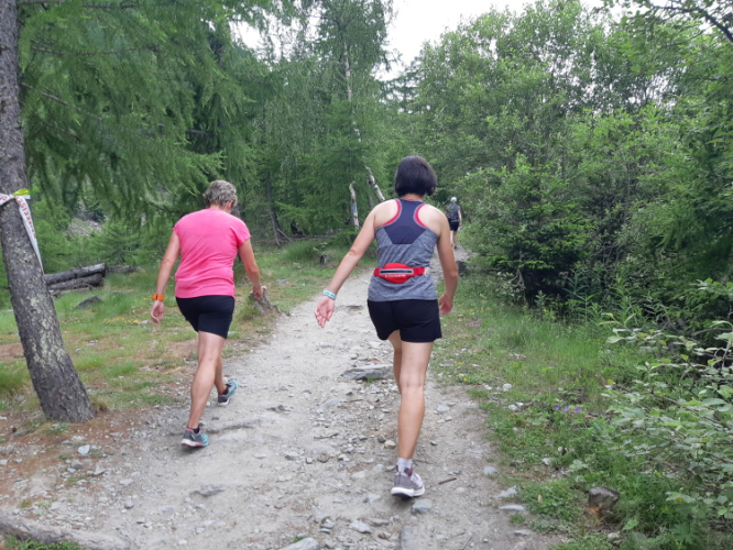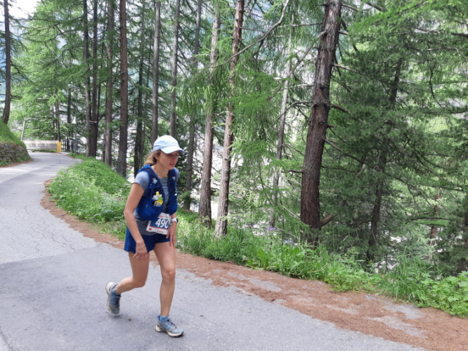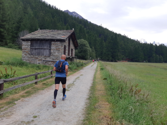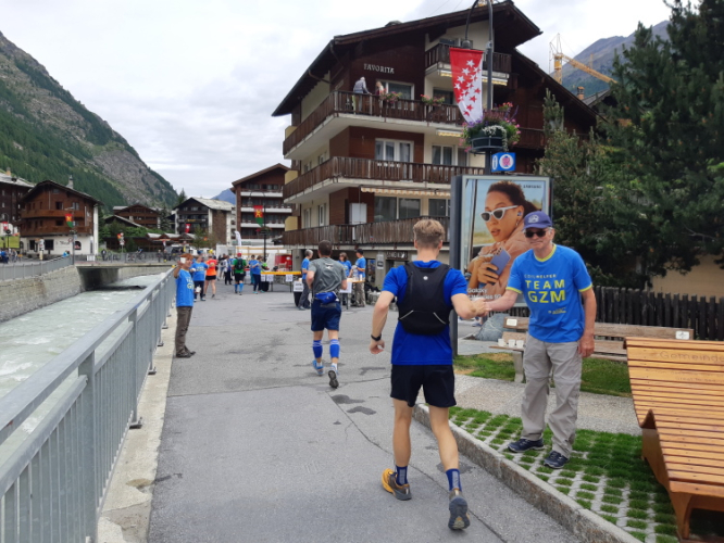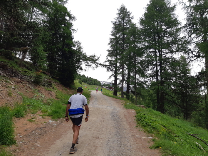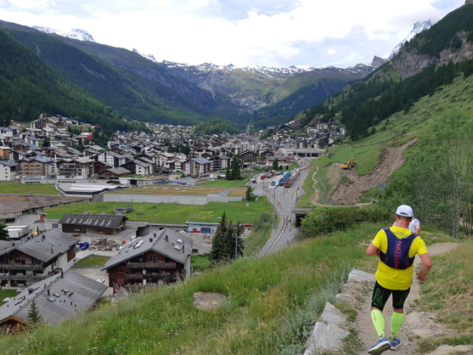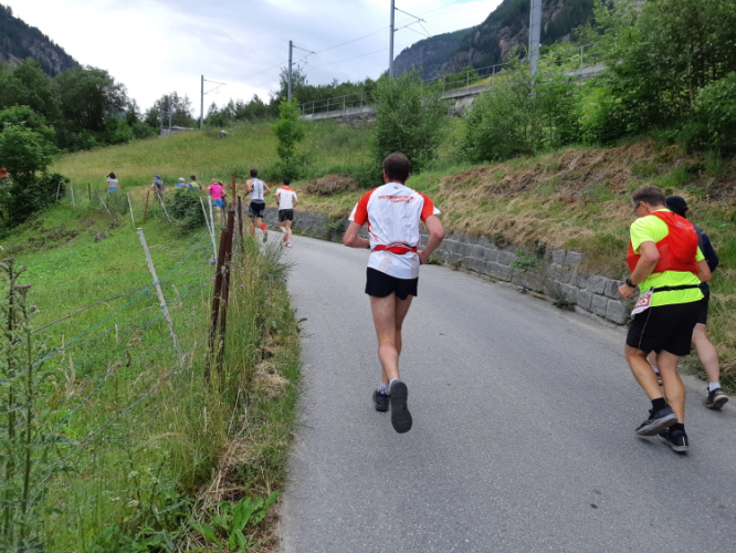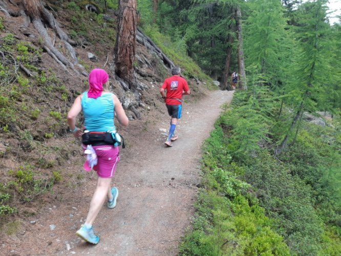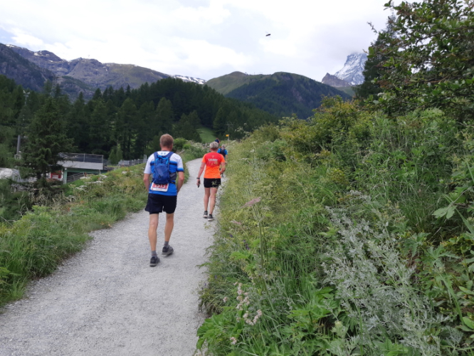Kurz danach erreichen wir den ersten Verpflegungspunkt Herbriggen. Die ausweislich ihrer Shirts genannten „Edelhelfer“ sind hier, wie an der ganzen Strecke, richtig gut drauf und reichen uns Wasser, Iso, Bananen, Schwämme, später auch Gel, Riegel, Cola und Bouillon. Ich schnappe mir je ein Becher Wasser und Iso und behalte dies fortan unter Ergänzung von Gel bei – meinem mitunter empfindlichen Magen war’s recht. Nah Herbriggen wechselt der Untergrund, nun geht es auf Forstwegen weiter. Es wechselt leider auch der Steigungswinkel, denn vor Randa müssen wir auf einem etwa 1 Kilometer langen Abschnitt ca. 100 Höhenmeter überwinden, die ich kräftesparend lieber gehe. Insgesamt verteilen sich auf die ersten 10 km bis Randa nur 280 Höhenmeter, weswegen die Bezeichnung „Flachetappe“ zumindest relativ gerechtfertigt ist.
