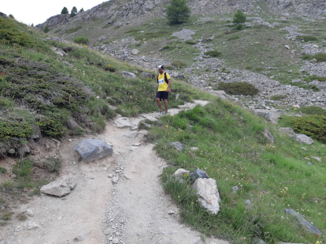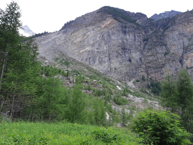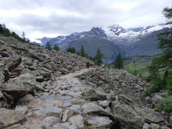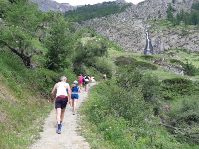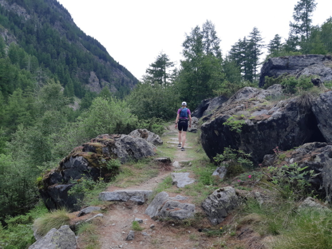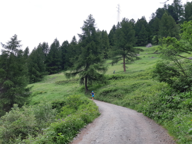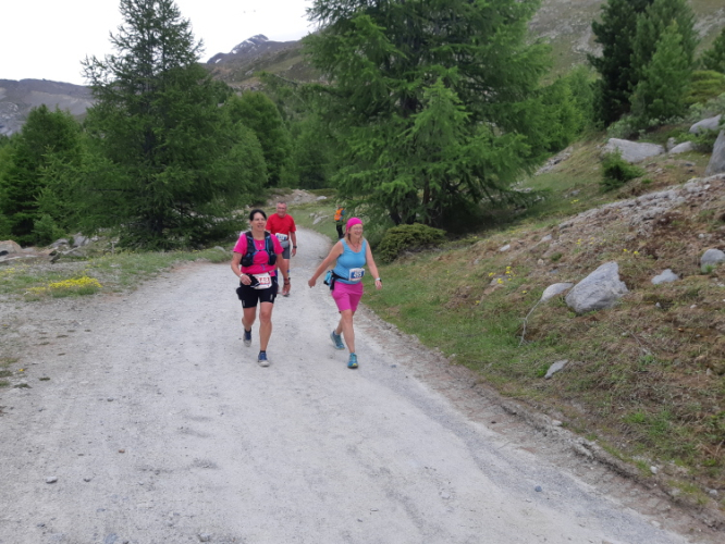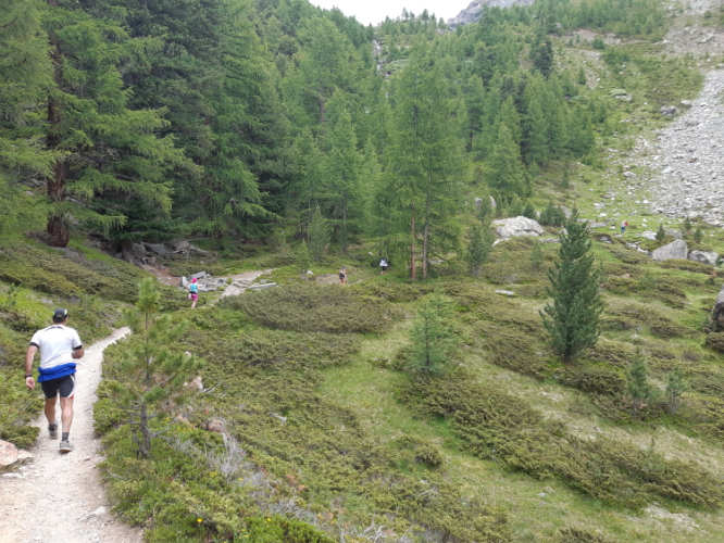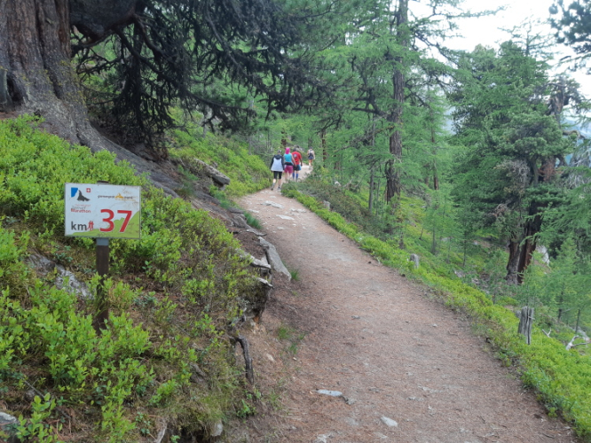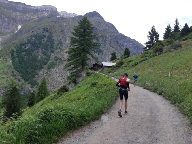 Wir passieren auf Holzbohlen einen kleinen Lärchenwald am Rande des Grindjisees und erreichen einen Schotterweg, der uns noch weiter in den Talschluss führt. Dann geht es mit Überquerung des Findelbaches bei km 35 an der anderen Talseite zurück. Vom Findelgletscher, der den Bach speist, ist hier nichts mehr zu sehen, nur das Geröll lässt erahnen, wie weit er einmal reichte. Beruhigend ist übrigens, dass ab Zermatt ca. alle 500 m ein Streckenposten vom Zivilschutz oder vom Helferteam auf uns aufpasst, selbst in dieser Abgeschiedenheit. Bis zur nächsten Versorgung an der Mountain Lodge „ze Seewjinu“ (km 36) führt uns ein meist ebener breiter Schotterweg. Ich bleibe dennoch lieber beim Gehen um mir Kräfte fürs Finale zu sparen.