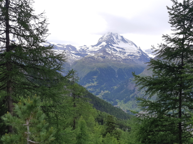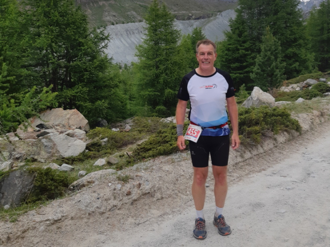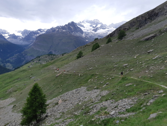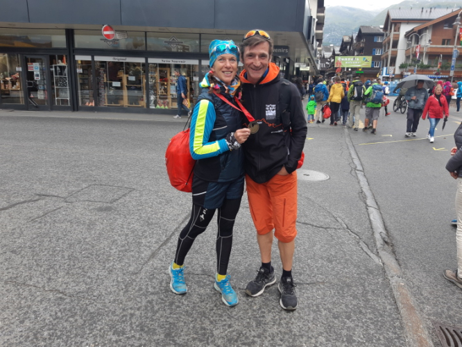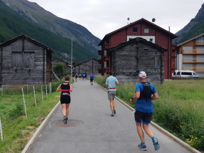Da ist es schon ein großer Zufall, dass ich auf Jens und Ricarda treffe, die Veranstalter der in der Ultramarathonszene bestens bekannten TorTour der Ruhr, einem Ultramarathon mit Distanzen ab 100 km. Mangels Pasta-Party führe ich mir in einem nahegelegenen Cafe Kohlenhydrate in Kuchenform zu und genieße dabei den Blick auf die hohen Berge. Das Wallis ist die Region mit der höchsten Konzentration von Viertausendern (38 von 82) in den Alpen. Und das Mattertal, in dem wir uns befinden, ist das tiefste Tal der Alpen. Ausschlaggebend für diese Bewertung ist die Höhendifferenz von über 3.900 Metern zwischen dem höchsten Berg und dem Talboden. Höchster Berg ist übrigens die Dofourspitze mit 4634 m und nicht das Matterhorn, welches es „nur“ auf 4478 m bringt.