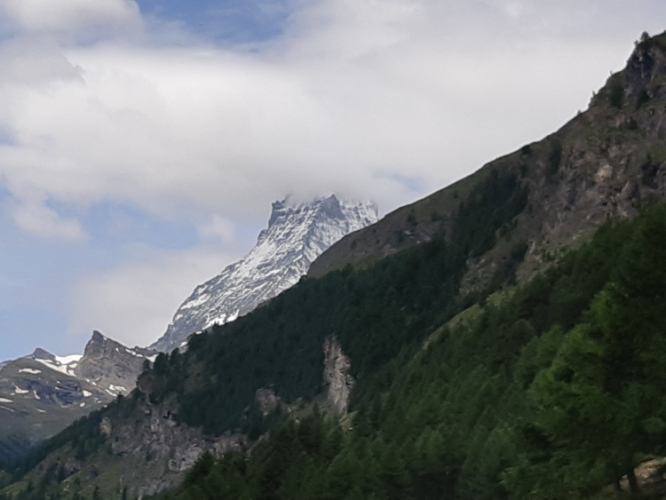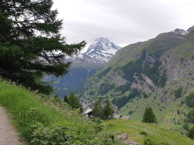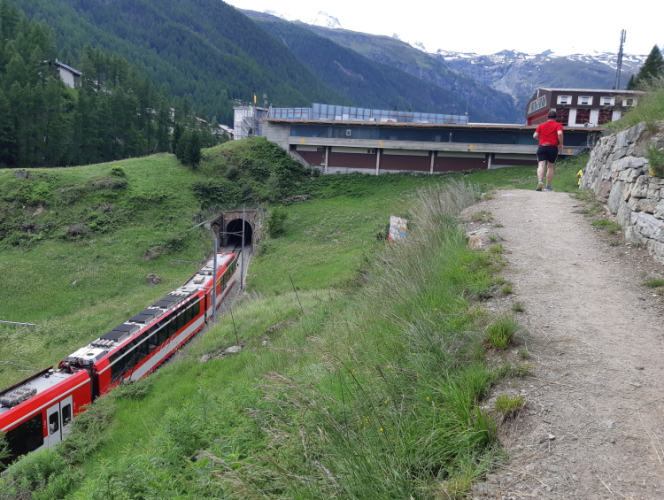 Fortan geht es wellig entlang des Flusses und der Bahnlinie entlang, felsiger Untergrund und leicht ausgesetzte Stellen erfordern jetzt mehr Aufmerksamkeit. Roland überholt mich und erzählt von seinen mehr als 10 Teilnahmen, davon 3*Ultra, beim GZM. Nur kurz stört ein Kies- und Betonwerk die Idylle des Trails, dem wir noch eine ganze Weile folgen. Dann ist plötzlich hinter einer Kurve „der schönste Berg der Welt“ sichtbar, jedenfalls der untere Teil, der Rest bleibt heute in den Wolken. Nun ist es nicht mehr weit bis Zermatt.