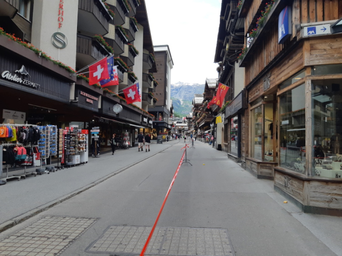 Der Heliport (Hubschrauberlandeplatz) am Ortsrand ist heute leergefegt, alles ausgeflogen. Liegt es daran, dass uns Läufern ein Gutschein von 30 CHF auf den Flugpreis von 220 CHF für eine Matterhornrundflug in den roten Helikoptern von Air Zermatt angeboten wird? Ich bleibe lieber am Boden, auch von dort weitet sich der Blick auf Zermatt. Wir laufen bergab zum Bahnhof (insgesamt verlieren wir auf der Strecke knapp 500 Höhenmeter), und gönnen uns dort wieder Verpflegung, bevor wir in Zermatt die Halbmarathonmarke erreichen.