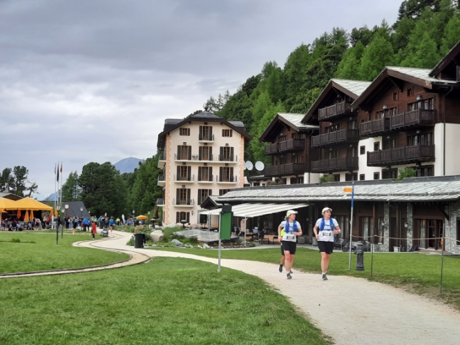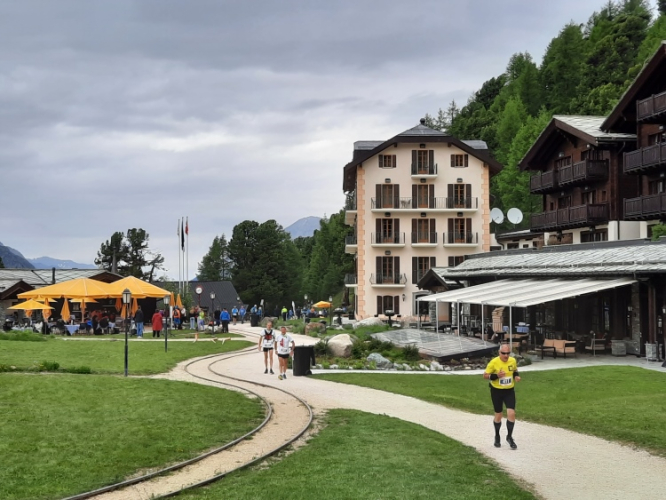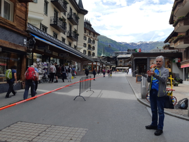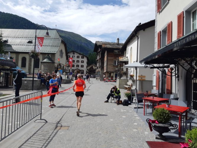 Dort ist auch Wechsel der Staffeln und Start des Halbmarathon, der aus Pandemiegründen zur Entzerrung der Teilnehmerfelder ausnahmsweise erst am Sonntag stattfindet. Dann geht es durch langgezogen durch Zermatt, heute ist es eher leer und von den gefürchteten Elektroflitzern, die sonst Fußgänger gewagt umkurven, ist auch nichts zu sehen. Imposante Gebäude erregen meine Aufmerksamkeit. Wie die Pfarrkiche St. Mauritius, hinter der sich der Bergsteigerfriedhof befindet - das Matterhorn ist nicht nur schön, sondern auch der gefährlichste Berg der Schweizer Alpen, wie sich schon bei der Erstbesteigung durch den Engländer Edward Whymper 1865 zeigte.