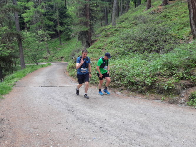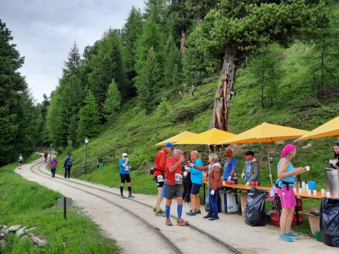 Auf 7 km haben wir fast 650 Höhenmeter vor der Brust, auf die uns eine kleine 2-Mann-Band musikalisch einstimmt. Immer wieder überholen mich nun Staffelläufer laufend, während die Marathonläufer unisono gehen. Trotz der nicht endend wollenden Steigung genieße ich die schöne Passage durch den Wald, freue mich aber auch, als die Verpflegungsstation an Patrullarve (km 28) auf 2000m das baldige Ende der Steigung ankündigt.
