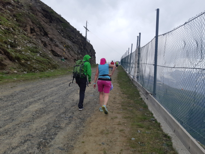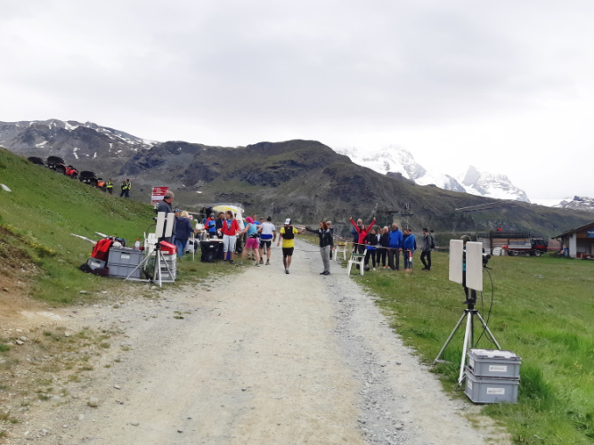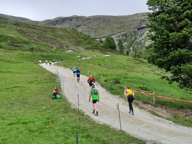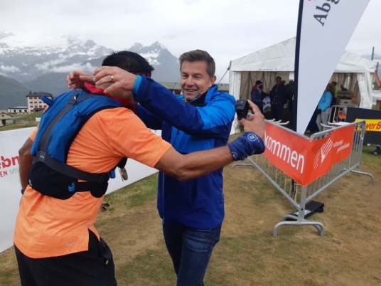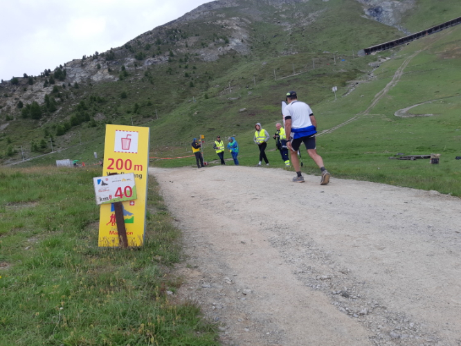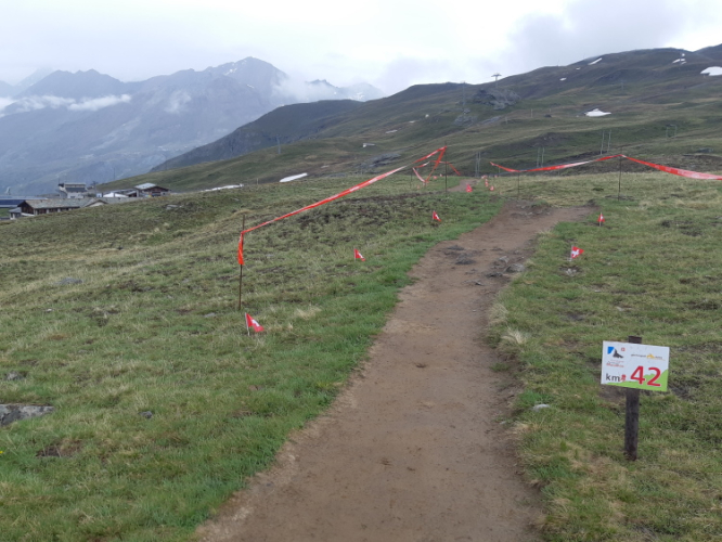 Auch Namensvetter Thomas scheint sich zu freuen, was mir angesichts der Tatsache, dass er barfuß läuft, nicht ganz erklärlich ist. Ab km 30 geht es weitgehend eben weiter, ich wechsele zeitweise wieder in den Laufschritt, bis zur nächsten Verpflegungsstelle bei km 32 Sunnegga (Sonnenecke) auf 2280m. Oberhalb der Baumgrenze ist es zweifelsohne eine sonnige Ecke, nur heute nicht. Dennoch ist viel los, da eine unterirdische Standseilbahn von Zermatt Besucher bequem in wenigen Minuten hier hochfährt. Man merkt der Landschaft bzw. den zahlreichen Bauten hier an, dass diese vorrangig auf den winterlichen Skibetrieb ausgelegt sind.