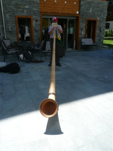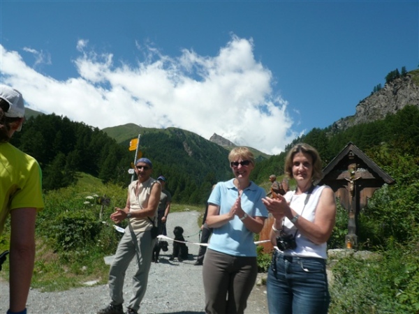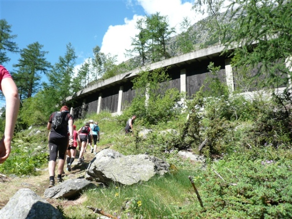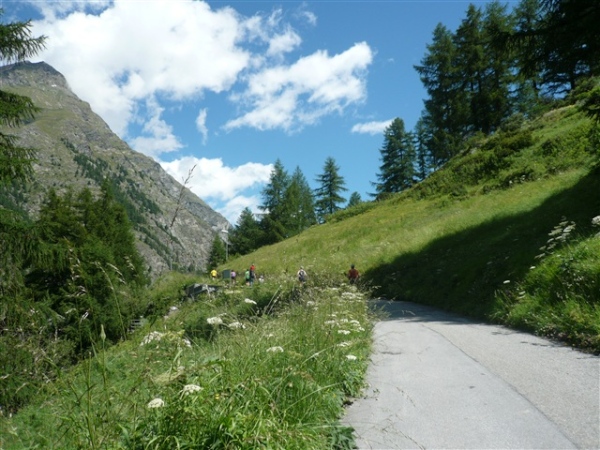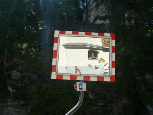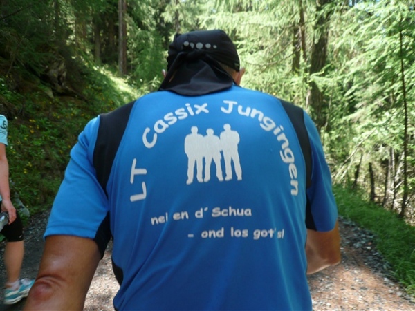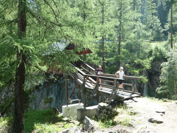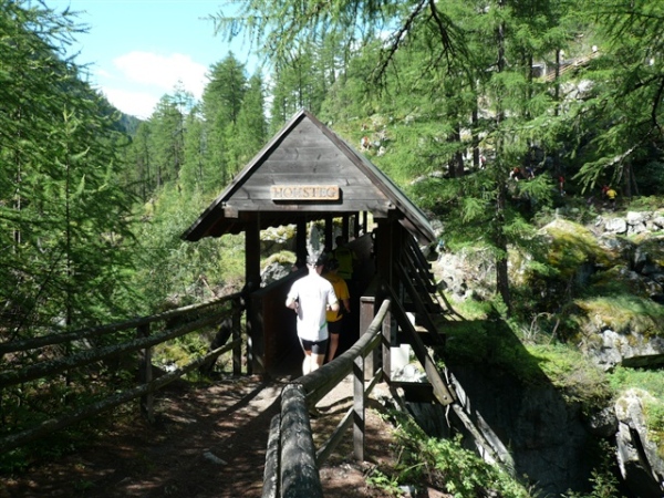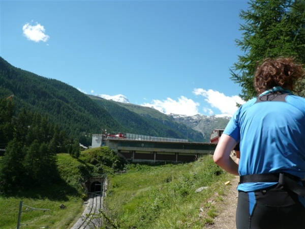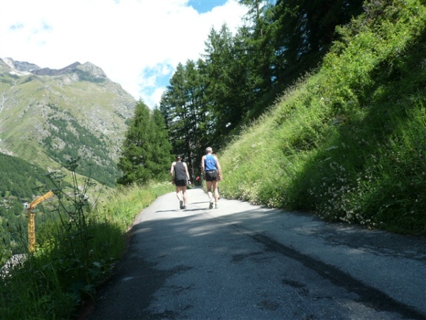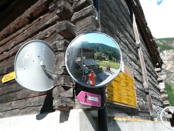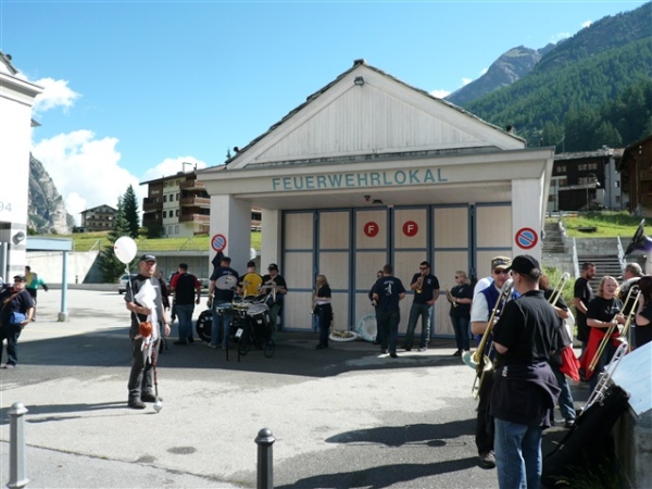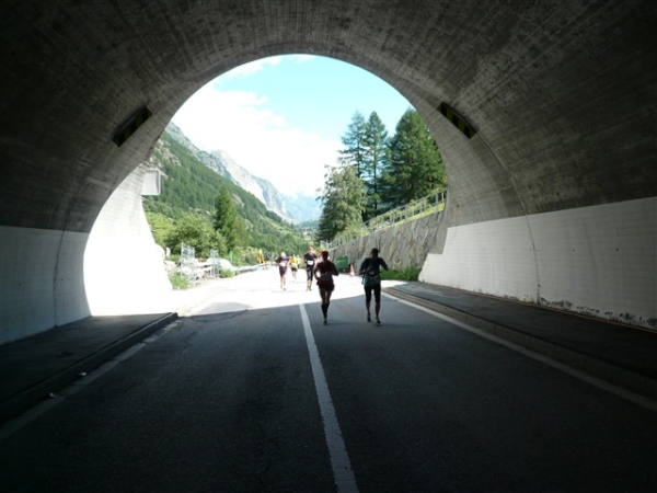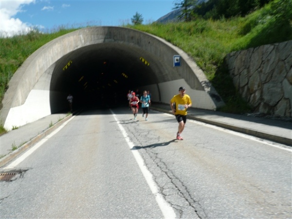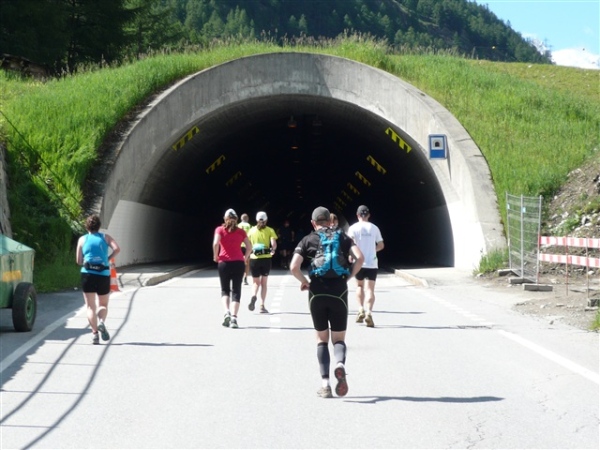 Vor dem Feuerwehrlokal hat die erste der heute aktiven Bands bereits Pause, wie übrigens später alle anderen auch. Alle. Keine einzige hat bei meinem Vorbeilauf gespielt, ich erwäge jetzt noch Protest einzulegen. Immer wieder säumen Vorratsspeicher den Weg, die auf hölzernen Füßen stehen, die ihrerseits wiederum von großen Felsplatten bedeckt sind: Eine einfache, aber wirkungsvolle Mäuseabwehr, wie ich meine. In Täsch erfolgt die nächste Verpflegung, auch der erste Gartenschlauch zum Abkühlen wird angeboten. Mittlerweile schon lange wieder auf Asphalt unterwegs, kommen wir so ganz langsam der Halbzeit näher. Wie gesagt, rein entfernungsmäßig. Gisela beschwert sich, daß ich sie exakt in dem Augenblick knipse, als sie zum ersten Mal eine kleine Gehpause einlegt. Ja, Mädel, shit happens! Immer wieder beliebt sind Tunnel: Kühl im Sommer werfen sie ein prima Echo von den Wänden und sind auch noch gute Fotomotive.