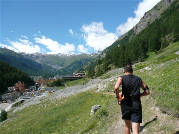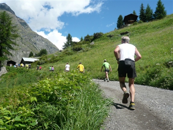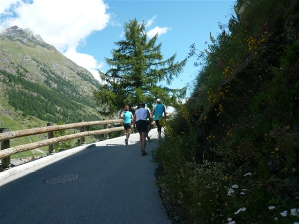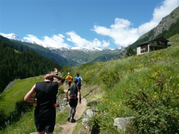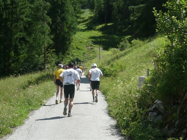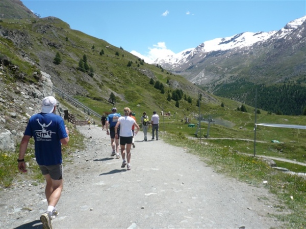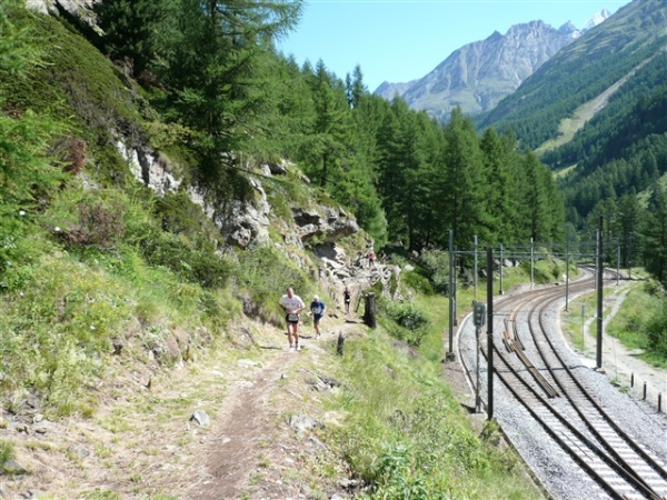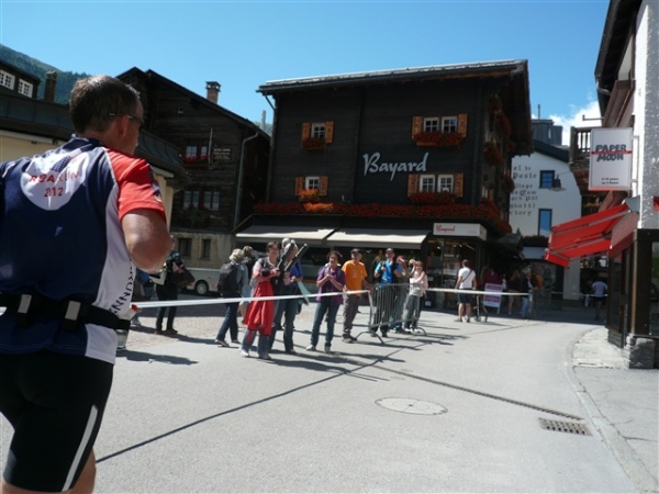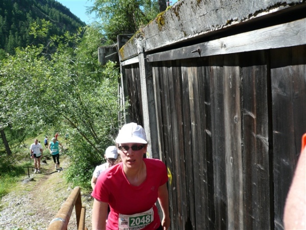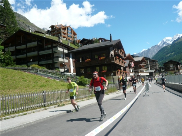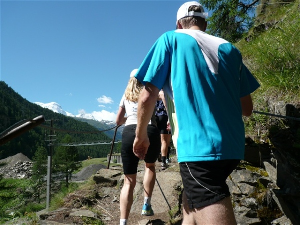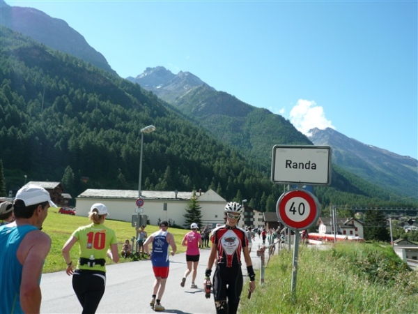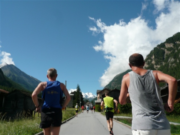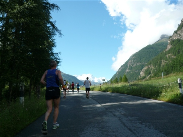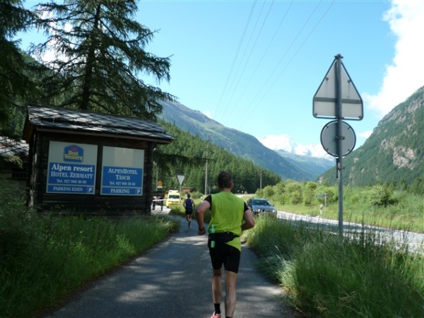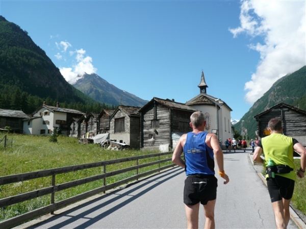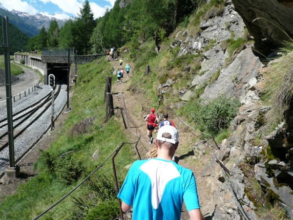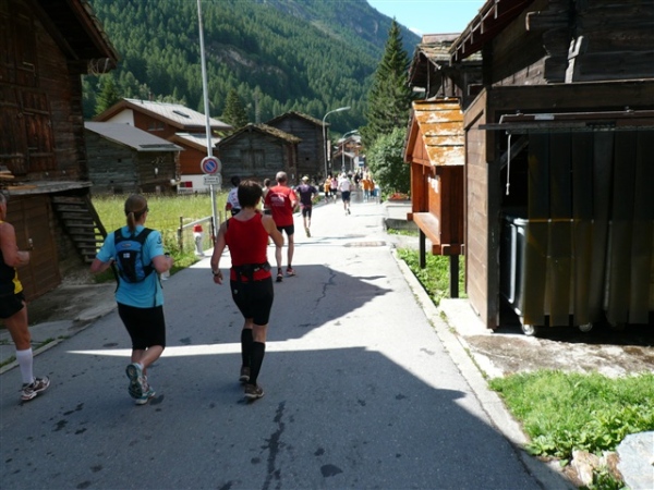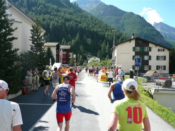 Wie dem auch sei – wir drehen eine große U-förmige Runde durch den Ort und kommen zugegebenermaßen doch noch an ein paar netten Gebäuden vorbei. Halbzeit habe ich bei etwa 2:10 Std., was nach ggü. den 2:03 bei der Jungfrau nachvollziehbar ist, da wir bis hierher ja die doppelten Höhenmeter zu absolvieren haben. Kurz hinter Zermatt geht’s dann aber ins Eingemachte, Wengen lässt grüßen. Mit der Lauferei ist es sehr schnell vorbei, jegliches Gespräch um mich herum verstummt und gemessenen Schrittes zieht die Karawane bergan. Und der Sultan hätt Dorsch.