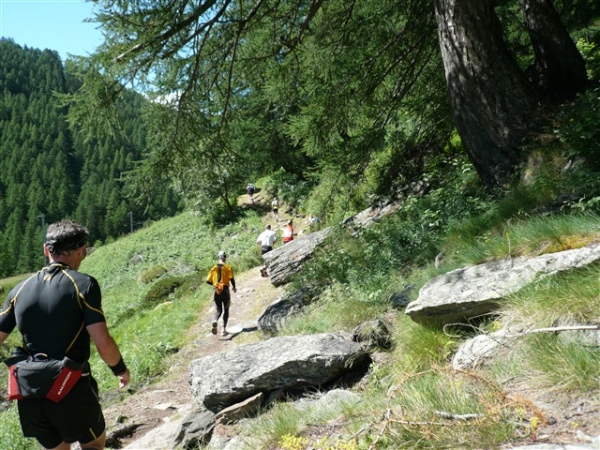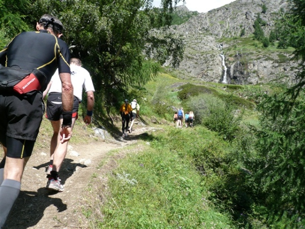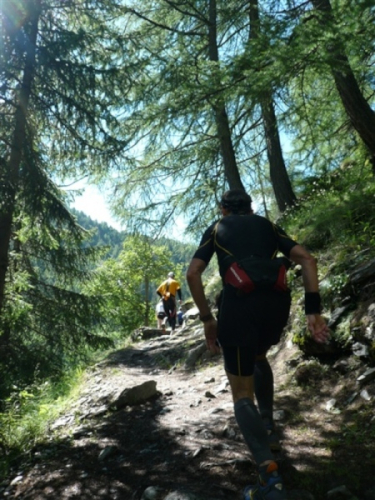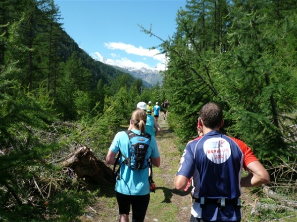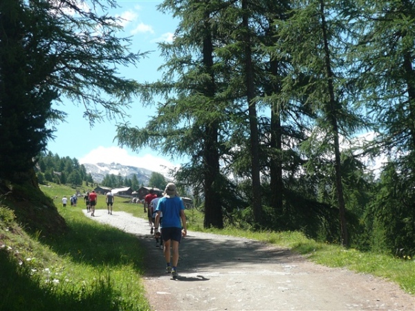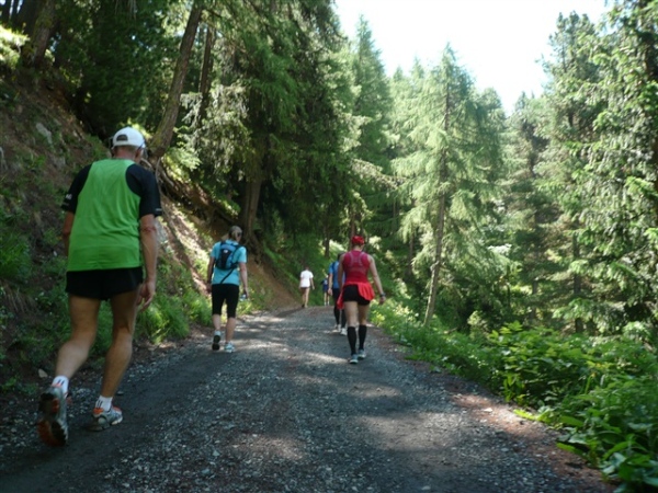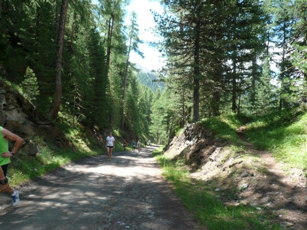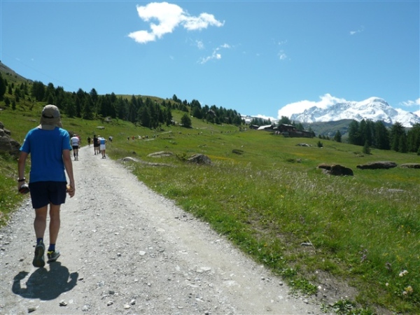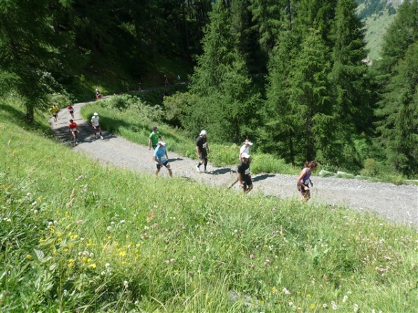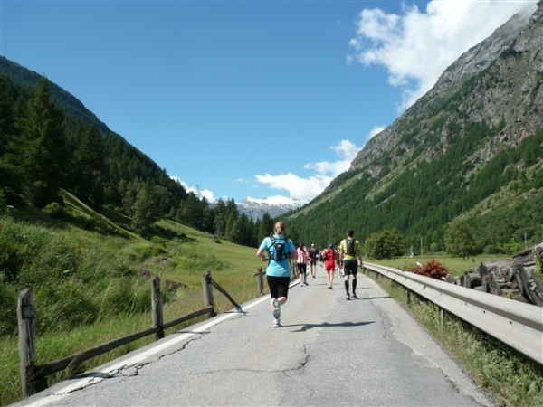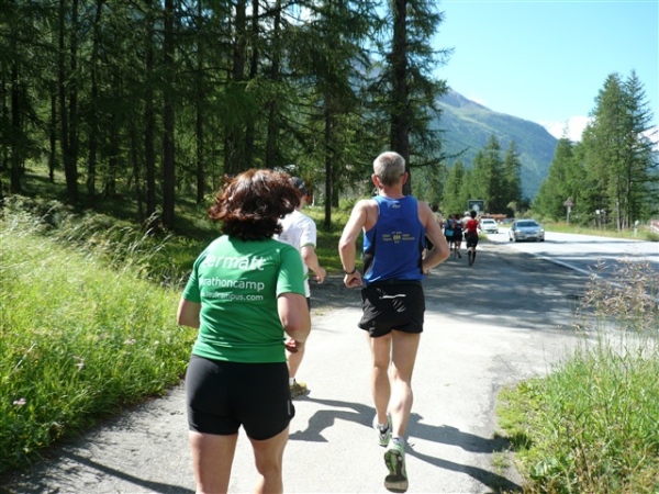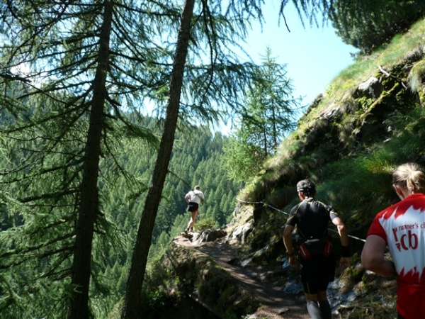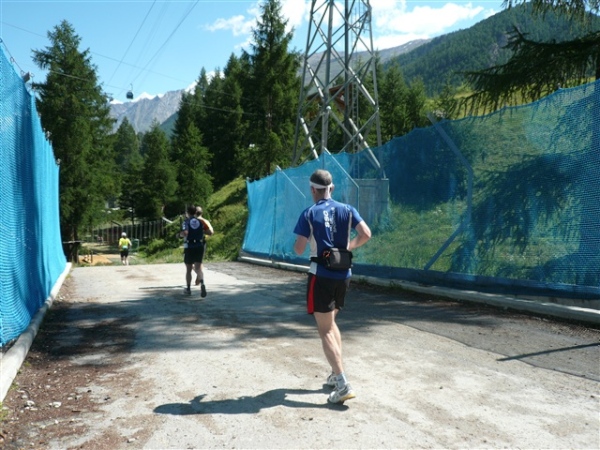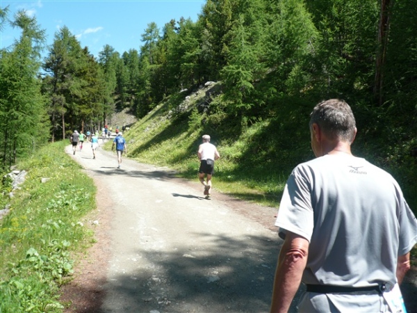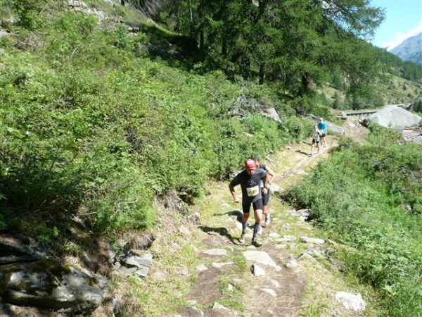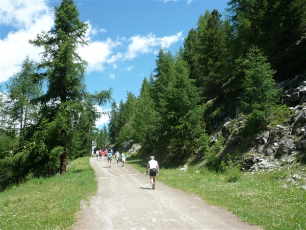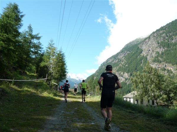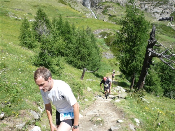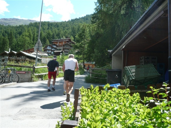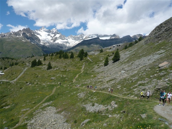 Wie dem auch sei – wir drehen eine große U-förmige Runde durch den Ort und kommen zugegebenermaßen doch noch an ein paar netten Gebäuden vorbei. Halbzeit habe ich bei etwa 2:10 Std., was nach ggü. den 2:03 bei der Jungfrau nachvollziehbar ist, da wir bis hierher ja die doppelten Höhenmeter zu absolvieren haben. Kurz hinter Zermatt geht’s dann aber ins Eingemachte, Wengen lässt grüßen. Mit der Lauferei ist es sehr schnell vorbei, jegliches Gespräch um mich herum verstummt und gemessenen Schrittes zieht die Karawane bergan. Und der Sultan hätt Dorsch.