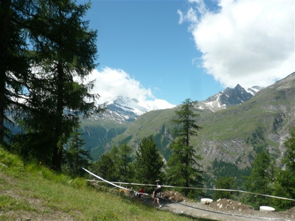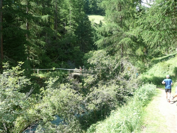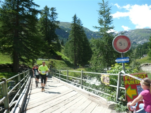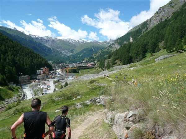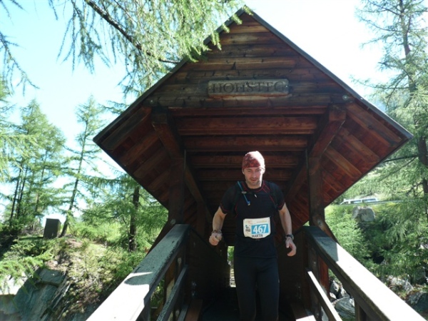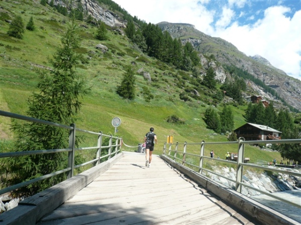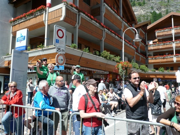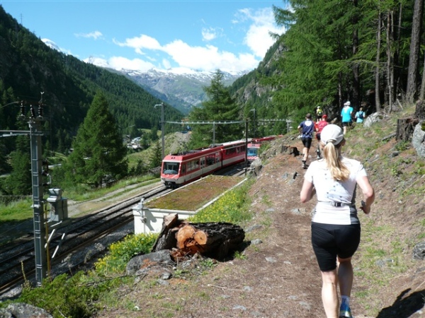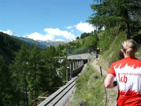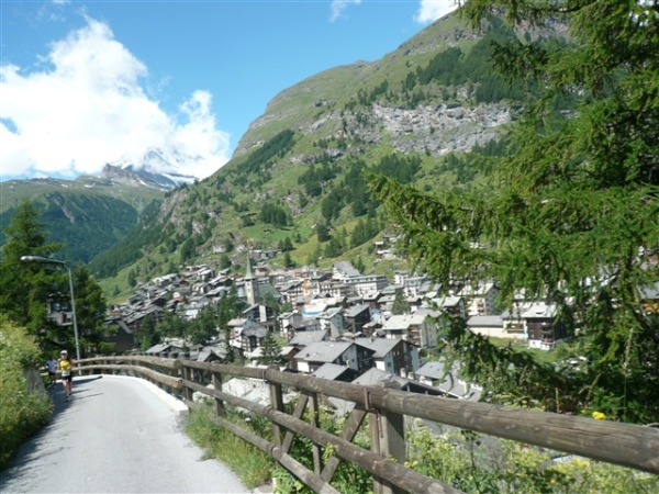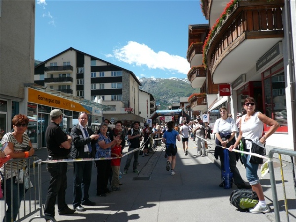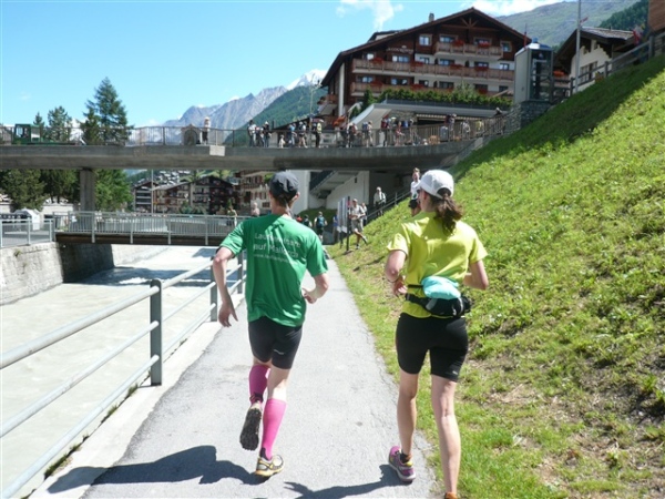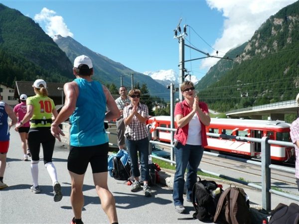 Vom Asphalt werden wir wieder reichlich entschädigt, schöne und angenehme Naturwege sind für die Beine die reinste Erholung und die kleinen, teils holzgedeckten Brücken echt etwas fürs Auge. Über mehrere enge Serpentinen schrauben wir uns wieder in die Höhe, nehmen tolle, aber anspruchsvolle Pfade auf und ab, bis wir einen ersten Blick auf Zermatt werfen können. Zermatt. Hmmm. Der erste optische Eindruck besteht aus Rohbauten und Kränen. Der zweite aus mit großen Häusern dichtbebautem Grund. Wirklich schön finde ich das nicht. Klasse ist aber auf jeden Fall der Empfang am Ortseingang, an dem der Staffelwechsel stattfindet und nicht nur unsere Fans jede Menge Alarm machen. Danach hält sich die Stimmung allerdings doch in Grenzen. Das ist bei der Jungfrau in Lauterbrunnen und Wengen völlig anders. Ob es daran liegt, dass nicht einer der 700 Helferinnen und Helfer aus Zermatt stammt, wie wir gelernt haben? Gibt es hier vielleicht örtliche Animositäten, die dazu führen, dass die Namensgeberin des Marathons nicht hält, was sie versprechen sollte?