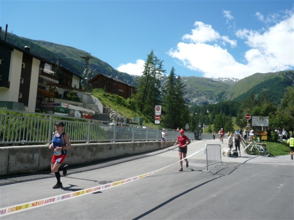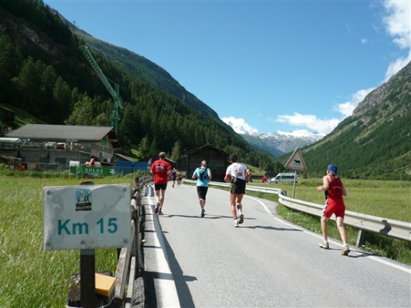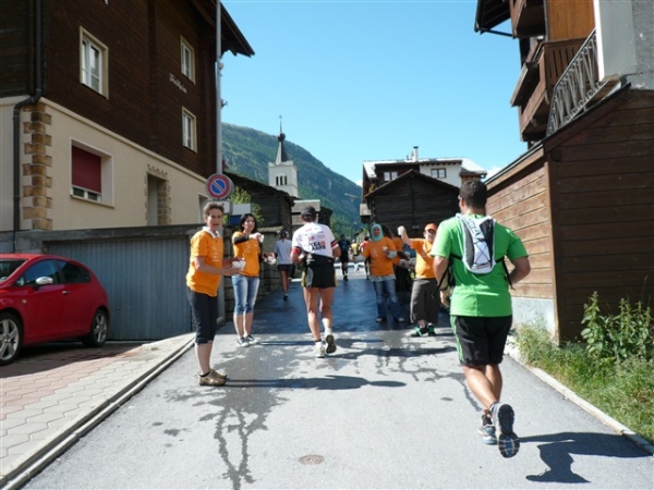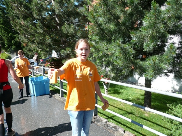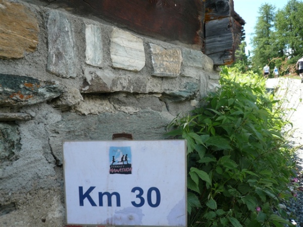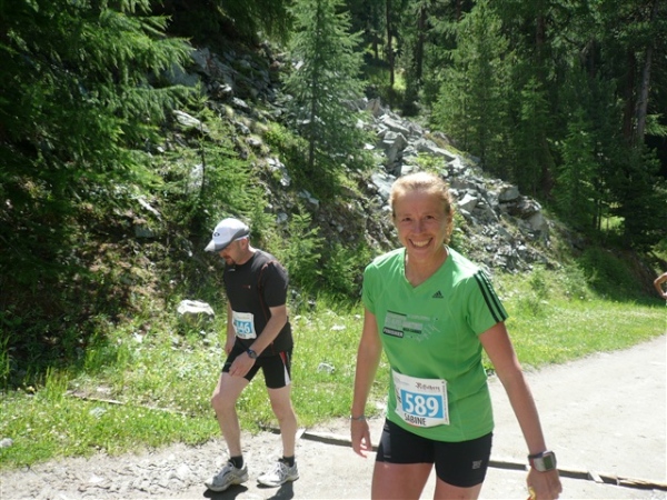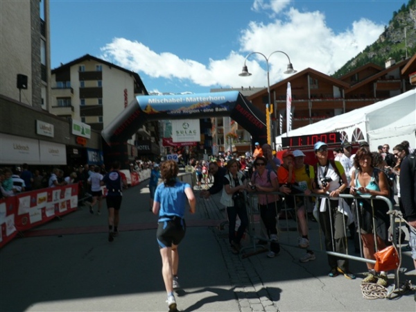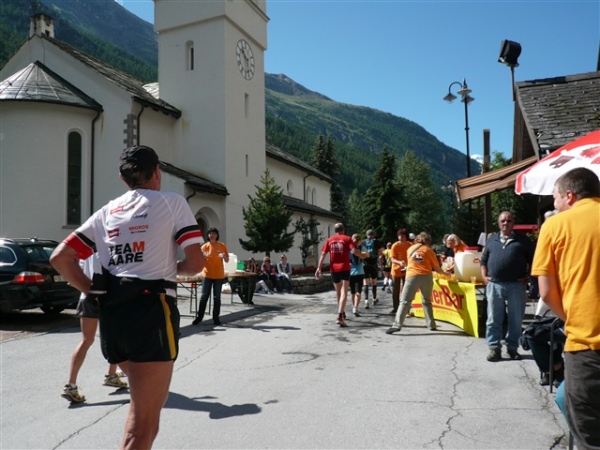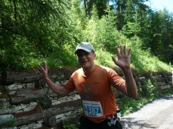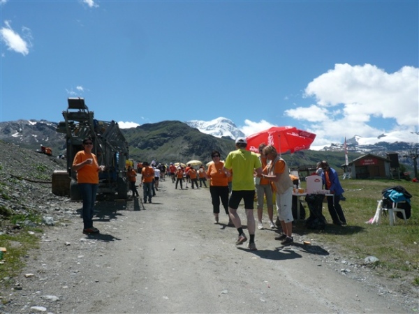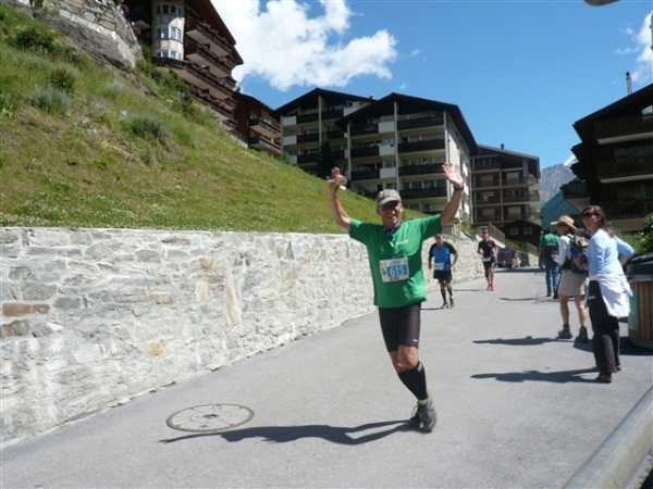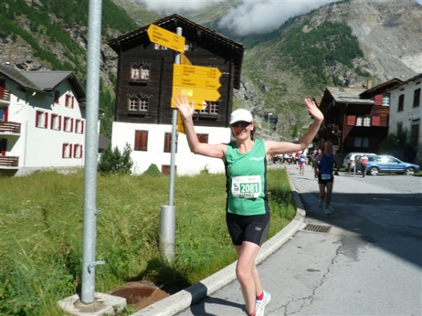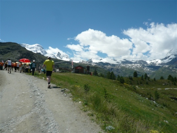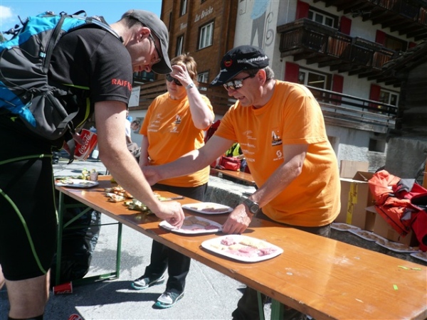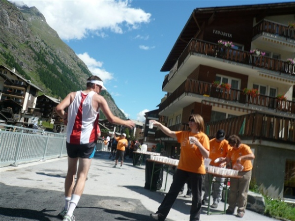 Ja, dann meine ich bei etwa Km 26,5 das Matterhorn zum ersten Mal zu erblicken. Außer mir schaut aber alles auf den Boden und ist mit sich selbst beschäftigt, daher bleibe ich etwas unsicher. Auf jeden Fall sieht das, was ich zu sehen meine, im wahrsten Sinne des Wortes hervorragend aus. Bei der nächsten Verpflegungsstelle steht ein kleiner Lkw der Feuerwehr, auf der Ladefläche vier Kinder. „Da sieht aber stark nach Ferien bei Euch aus!“, meine ich. „Das SIND Ferien!“ schallt’s heraus und die Gesichter strahlen. A propos strahlende Gesichter: Sabine Meier aus Hannover spricht mich an. „Schreibst Du wieder einen Bericht, Wolfgang? Die lese ich doch immer!“ Sabine, Du warst pures Doping für mich, schade, dass ich schon verheiratet bin.