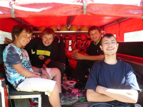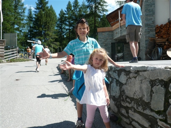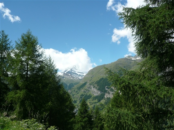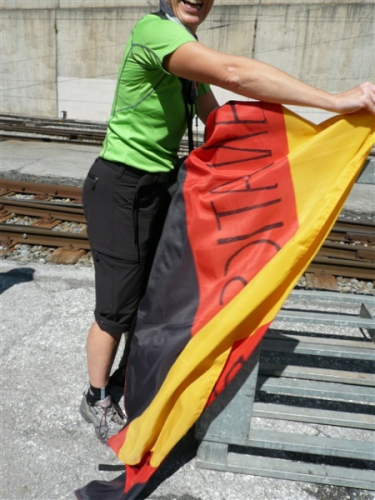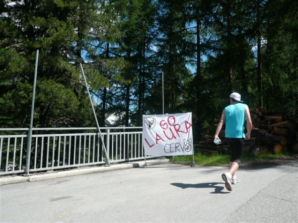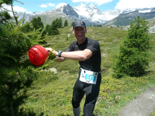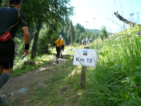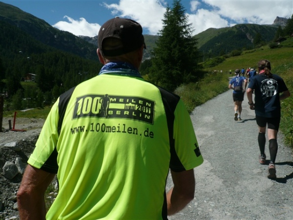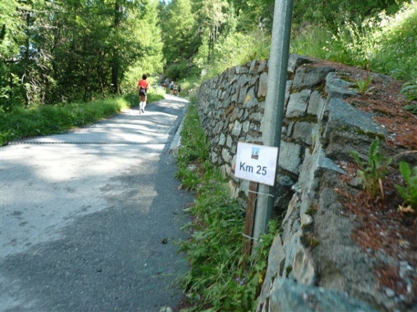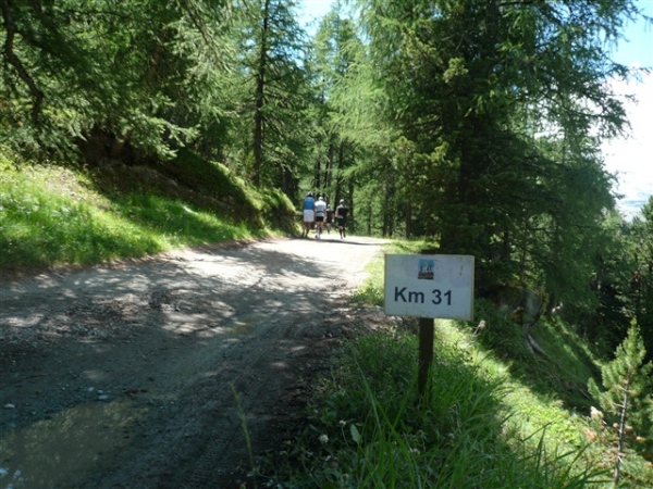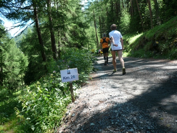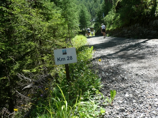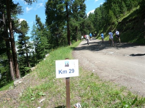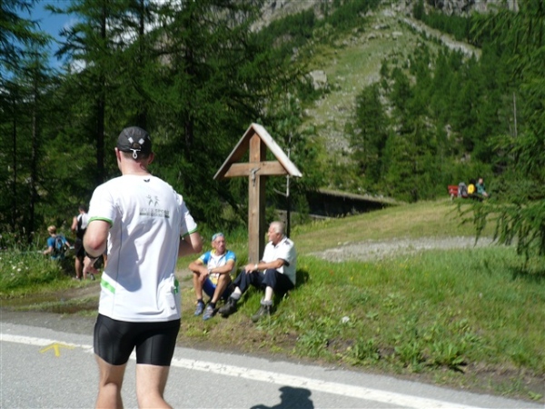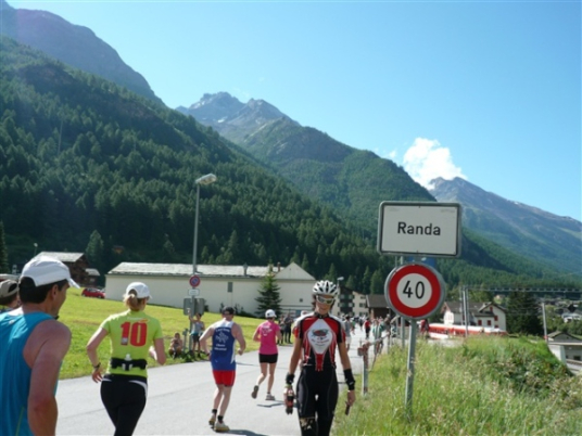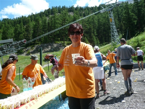 Ja, dann meine ich bei etwa Km 26,5 das Matterhorn zum ersten Mal zu erblicken. Außer mir schaut aber alles auf den Boden und ist mit sich selbst beschäftigt, daher bleibe ich etwas unsicher. Auf jeden Fall sieht das, was ich zu sehen meine, im wahrsten Sinne des Wortes hervorragend aus. Bei der nächsten Verpflegungsstelle steht ein kleiner Lkw der Feuerwehr, auf der Ladefläche vier Kinder. „Da sieht aber stark nach Ferien bei Euch aus!“, meine ich. „Das SIND Ferien!“ schallt’s heraus und die Gesichter strahlen. A propos strahlende Gesichter: Sabine Meier aus Hannover spricht mich an. „Schreibst Du wieder einen Bericht, Wolfgang? Die lese ich doch immer!“ Sabine, Du warst pures Doping für mich, schade, dass ich schon verheiratet bin.