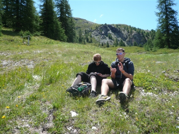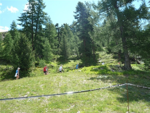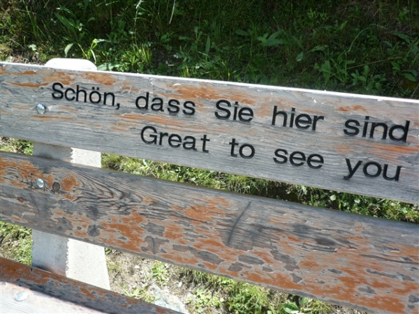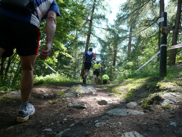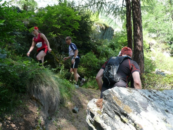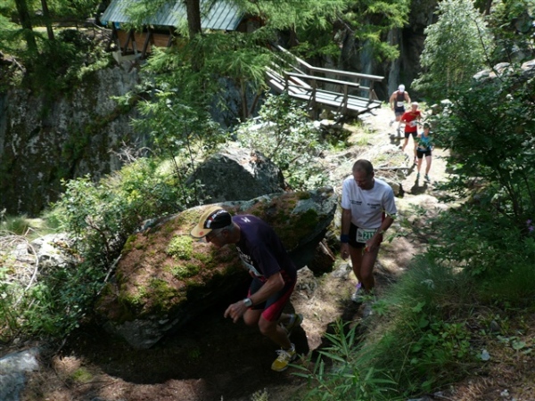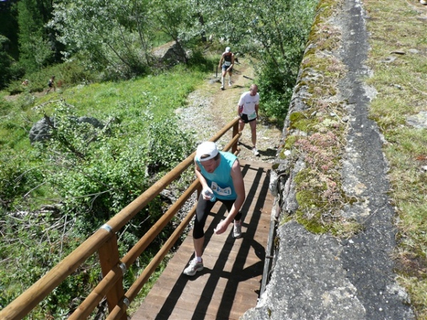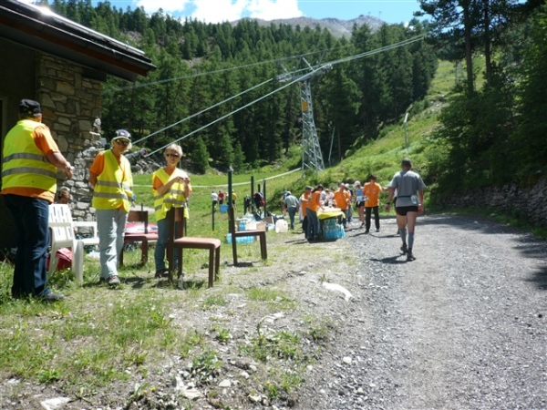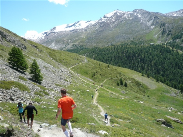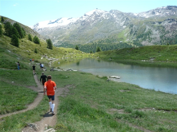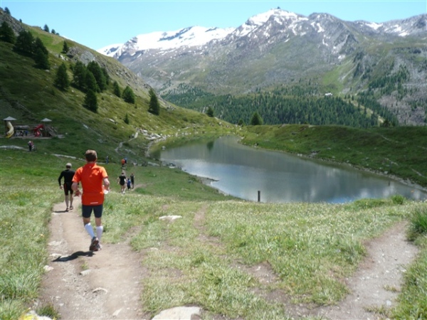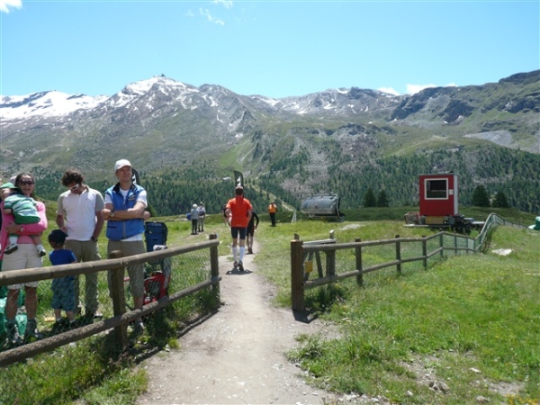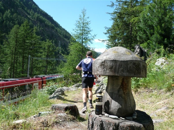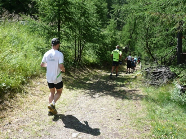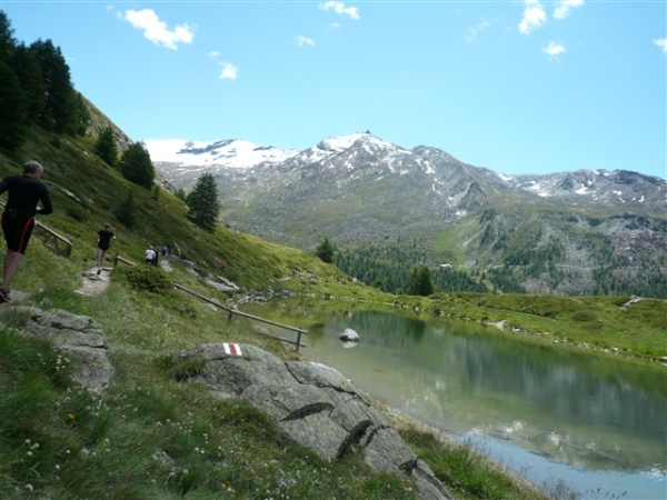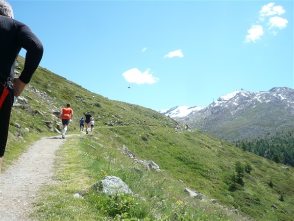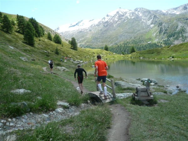 Die Bergwelt über uns öffnet sich mehr und mehr und ruft echte Begeisterung in mir hervor. Weißer Schnee auf grauem Stein, der sich scharf vom blauen Hintergrund abhebt, hier und da ein paar Wölkchen – Herz, was willst Du mehr? Was zu trinken, ich könnte saufen, wie ein Kamel. Überwiegend schattenlos geht es weiter, aber die nächste Versorgung ist nicht wirklich weit. Dann der erste Bergsee unter uns, wieder Singletrail, ein rundes Holzbrückchen, ich könnte schweben. Dann der Jörg, der ein rotes Luftballonherzchen für seine Liebste an einem Busch befestigt. Ich habe den starken Verdacht, daß Du derjenige bist, der, von der Öffentlichkeit nicht ganz unbemerkt, im Ziel seinen Schatz mit einem Blumenkranz erwartete und ihr per Mikro einen vielumjubelten (und vor Zeugen angenommenen) Heiratsantrag machte. Was ist das alles einmal schön. Ihr Schweizer solltet Euch mal einig werden, ob es an der folgenden Verpflegung nun Sunegga oder Sunnegga heißt.