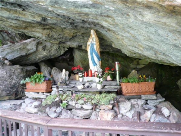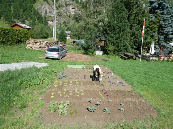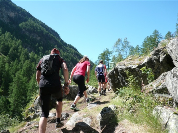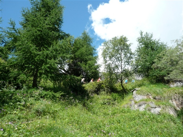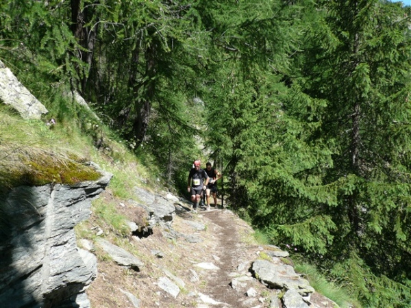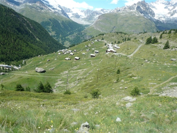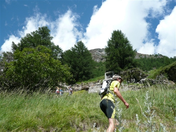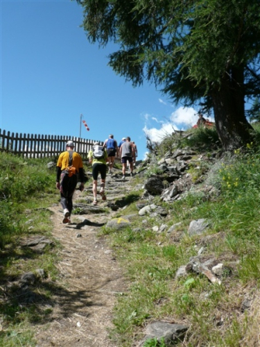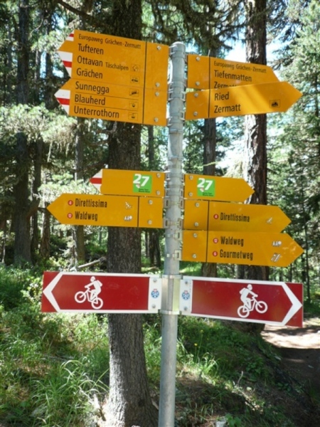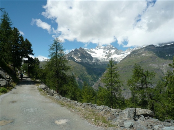 Auf dem siebten Km geht mir für heute erstmals das Herz auf: Ein Naturpfad durch den Wald ist genau die Art von Weg, wie ich ihn liebe, ist aber durchaus anspruchsvoll. Weniger vom Untergrund her, der ständige Wechsel zwischen hell und dunkel erzwingt högschte Aufmerksamkeit. Nach zwei weiteren Km geht es erstmals heftig nach oben, die ersten wandern bereits, bei mir ist es grenzwertig. Bevor ich es mir anders überlegen kann, ist der Scheitelpunkt erreicht. Kurz vor dem nächsten Ort, Randa, sehen wir das Resultat eines schweren Bergsturzes vom April und Mai 1991: Millionen von Kubikmetern Fels und Geröll hatten sich vom Berg gelöst und beginnen sich erst ganz langsam wieder mit Grün zu füllen, eine schwere, nach über zwanzig Jahren immer noch unvernarbte Wunde. In Randa ist das erste Viertel geschafft, natürlich rein entfernungsmäßig gesehen, angesichts des noch zu Erwartenden eigentlich kaum erwähnenswert.