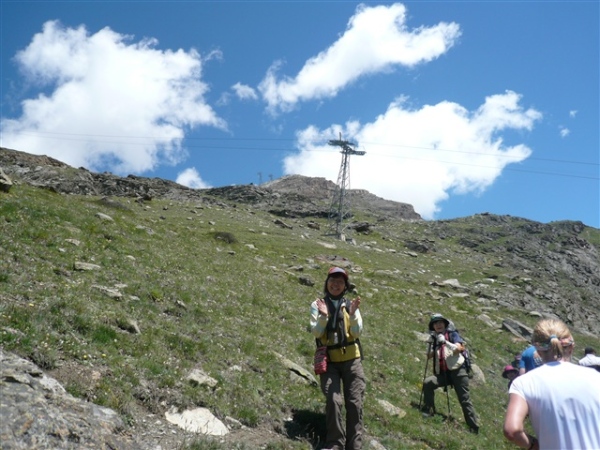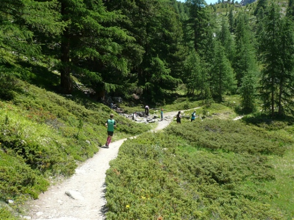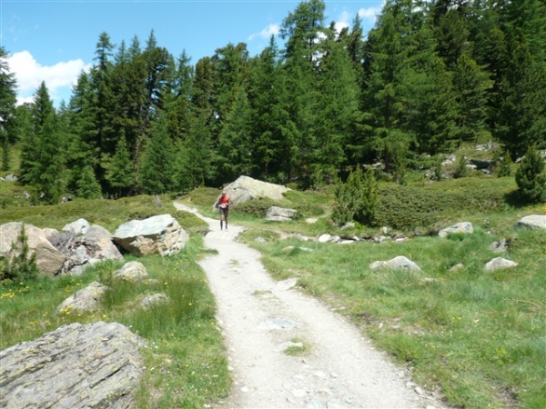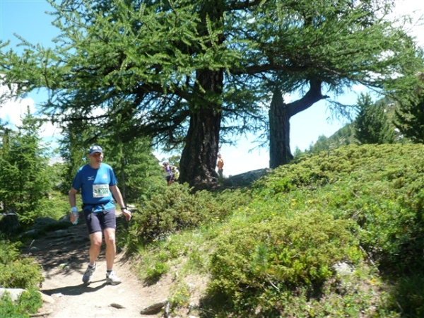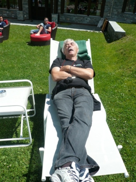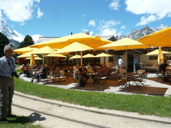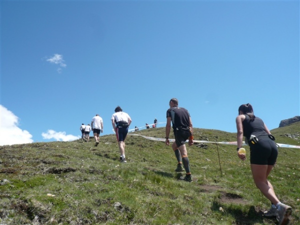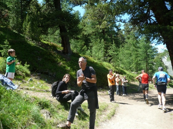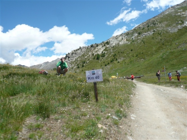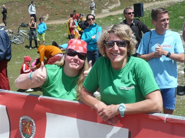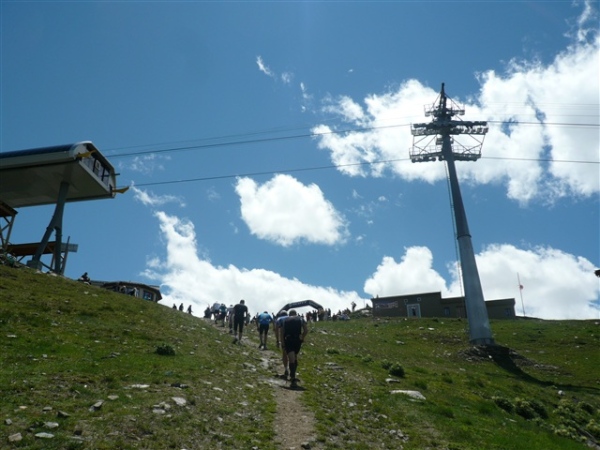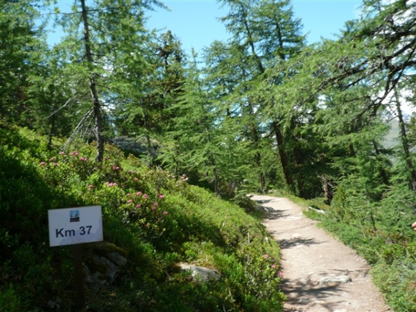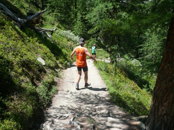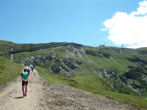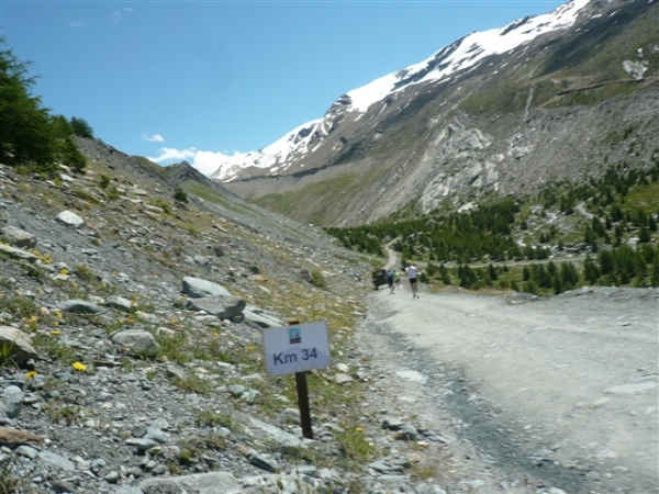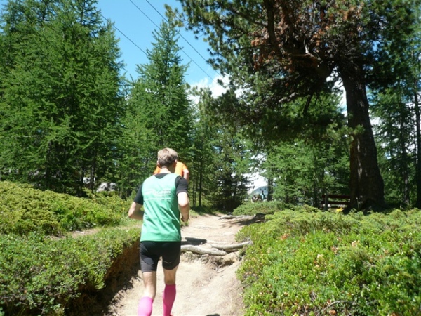 Die Kamera streikt ab sofort, hat also doch etwas abbekommen, Mist. Akku rein-raus, Chip rein-raus, nichts hilft. Aus, ein, keine Chance. Klar, wenn man beim Sturz das Rädchen auf Filmen dreht, kann sie auch nicht auslösen, Schwein gehabt. Weiter. Viel geht es abwärts zwischen den Km 32 und 37, rund läuft es sich trotzdem nicht mehr vollständig, aber es geht immer weiter. An der Station Riffelalm stehen Elke und Barbara, schön, Euch zu sehen, insbesondere, wenn mit einem noch gar nicht gerechnet wurde. Die Kapelle hat natürlich Pause, wie alle anderen auch, dafür kann sich ein Kurgast auf einer Liege bei der Ruhe einen Wolf schnarchen. Weiter aufwärts geht es, immer weiter, Schritt für Schritt unter der gnadenlosen Sonne.