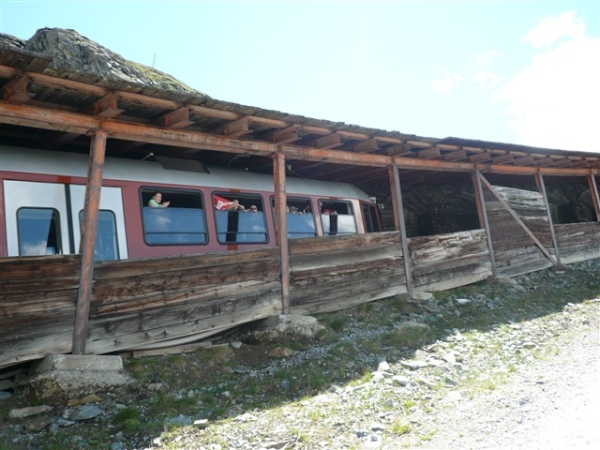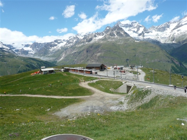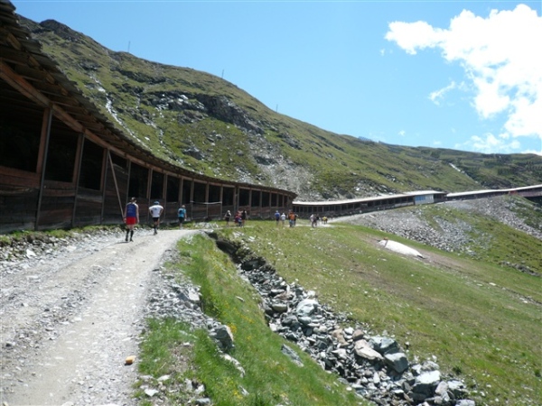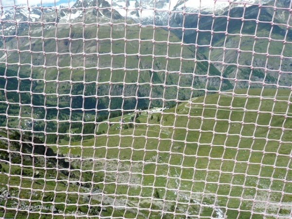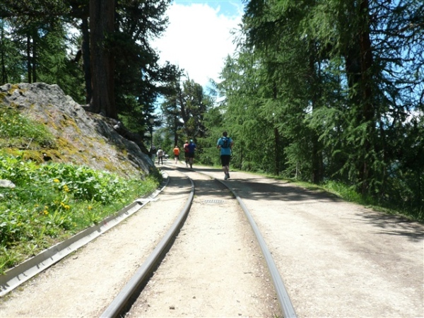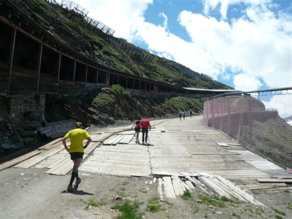 Und dann, kurz vor Km 40, sehe ich sie erstmals aus der Perspektive des Fußgängers: Die Rampe! Sagenumwoben wie die „Wand“ nach Wengen beim Jungfrau-Marathon, zieht sich die gegen Steinschlag und Lawinen eingehauste Bahnlinie steil zum Riffelberg hoch. Rechts von ihr führt uns nun der Weg auf dem vermeintlich finalen Anstieg nach oben, zunächst noch auf Schotter, begleitet von aus dem Zug lärmenden Fans, die uns lautstark Anerkennung zollen. Der Schotter- geht in einen breiten Bohlenweg über, der gegen Absturz durch große Netze gesichert ist. Das sind die Bilder, die man immer wieder im Vorfeld gesehen und sich darauf gefreut hat, jetzt darf man hier höchstpersönlich durch und weiß, daß das Ende naht. Das des Laufs, wohlgemerkt!