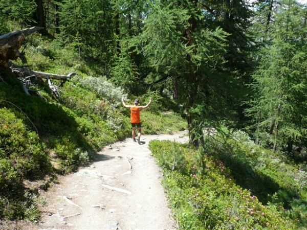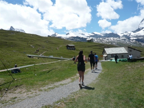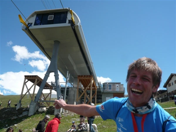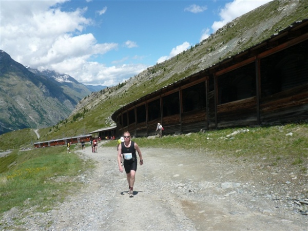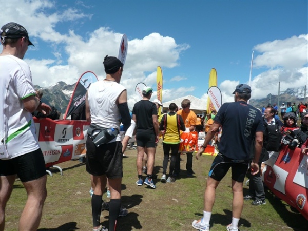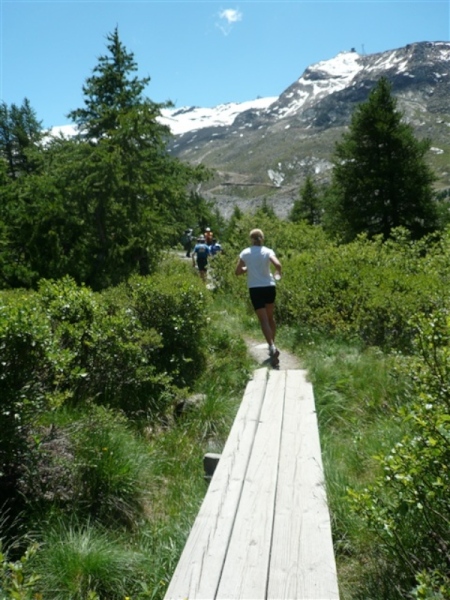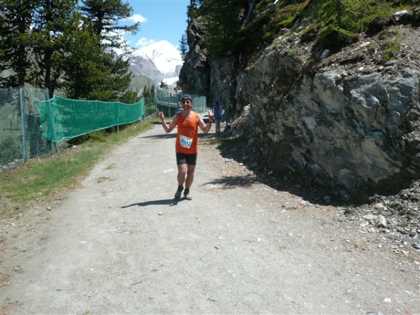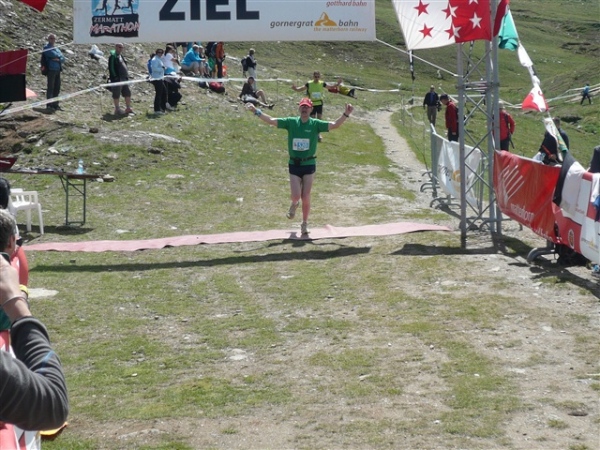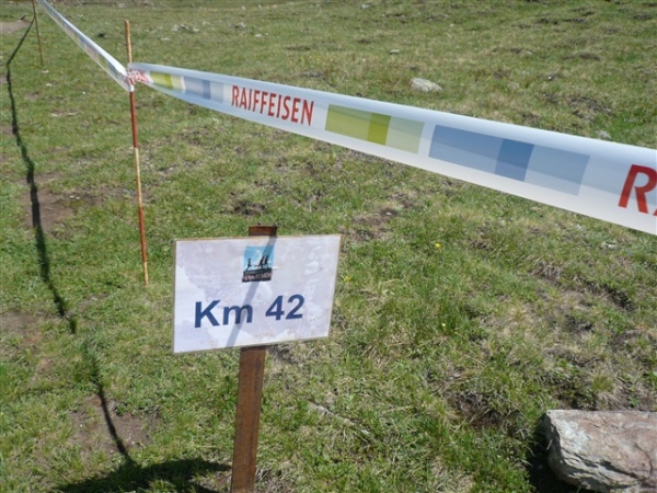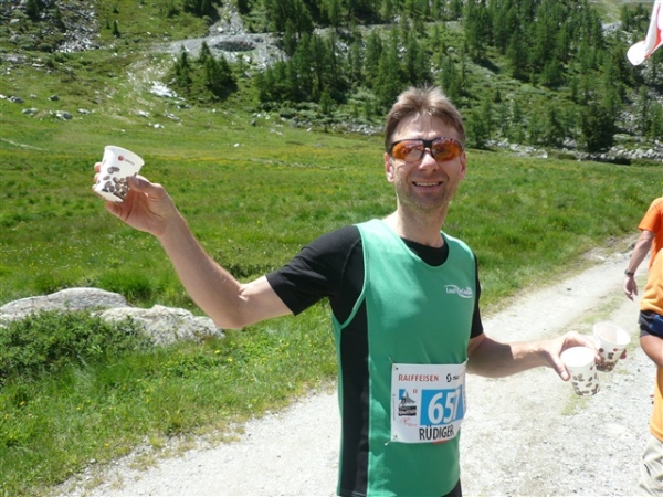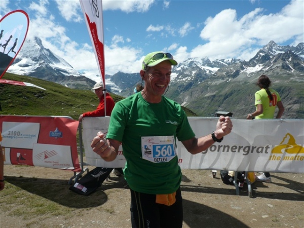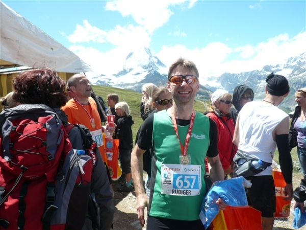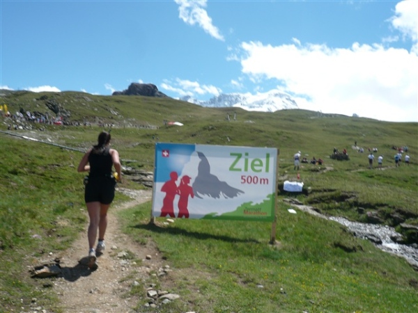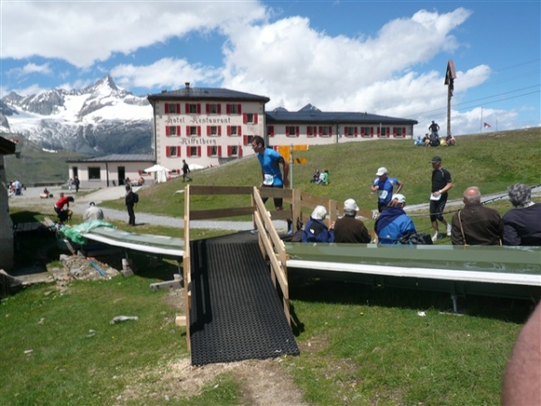 Auf der Bergspitze am höchsten Punkt des Wegs sehe ich einen aufgeblasenen Bogen, weiß aber aufgrund der Vorbesichtigung, daß dies nur ein Werbebogen ist. Wehe dem, der hier den Zielstrich vermutet! Peter, der es schon längst geschafft hat, kommt mir entgegen: „Hau rein, Du Sau!“ Ich unterstelle, daß er es nicht wörtlich meint und klatsche ihn nur ab. Wieder leicht abwärts, eine kleine Brücke, „Ziel 500 m“, sagt das große Banner. Fertigmachen zum entspannten Zieleinlauf! Und wieder sind einige kleine An- und Abstiege über ganz schmale Pfade zu nehmen, aber die Beine sind angesichts des nahen Finales erstens leicht und zweitens macht Überholen eh keinen Sinn mehr. Km 42, jetzt nur nicht noch mal hinlegen beim letzten Bergabstück und dann, nach 5:13 Std., 10 min. früher als bei der Jungfrau, is et eröm mit der Springerei. Ehrlich – den Gornergrat hätte ich jetzt noch gerne drangehängt. Das Sahnehäubchen zum Ultra mit weiteren 500 Höhenmetern auf 4 Km aber gab es nur im letzten Jahr zum zehnjährigen Jubiläum. Und wird aufgrund des großen Erfolgs im kommenden Jahr erneut angeboten.