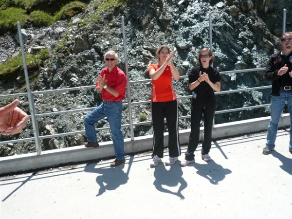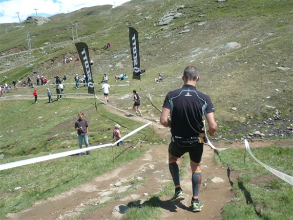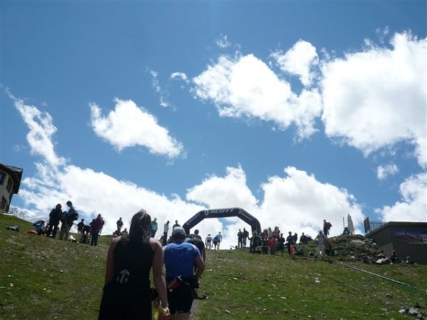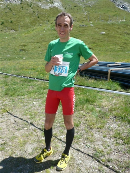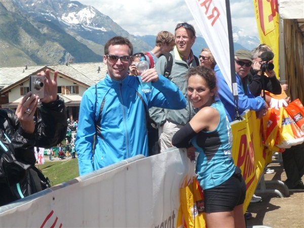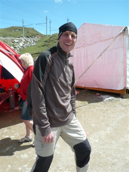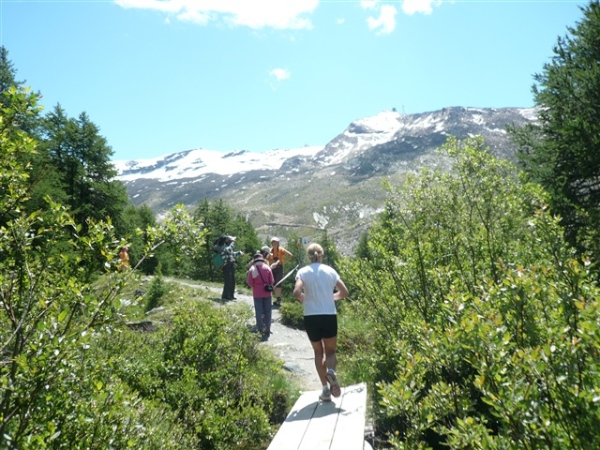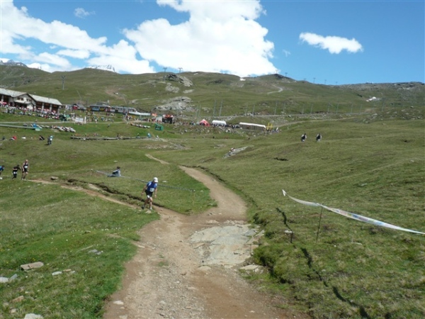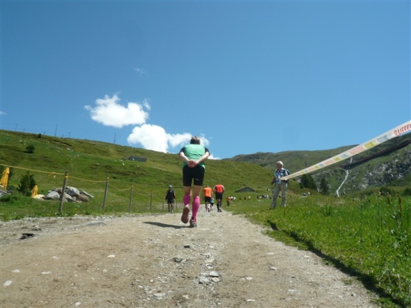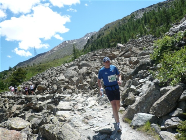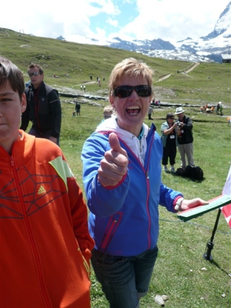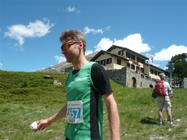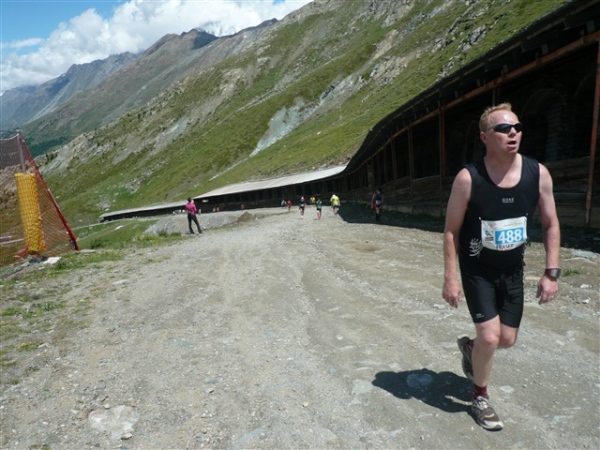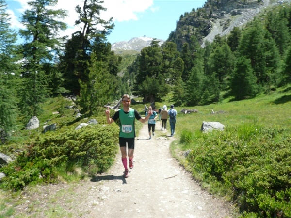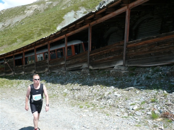 Auf der Bergspitze am höchsten Punkt des Wegs sehe ich einen aufgeblasenen Bogen, weiß aber aufgrund der Vorbesichtigung, daß dies nur ein Werbebogen ist. Wehe dem, der hier den Zielstrich vermutet! Peter, der es schon längst geschafft hat, kommt mir entgegen: „Hau rein, Du Sau!“ Ich unterstelle, daß er es nicht wörtlich meint und klatsche ihn nur ab. Wieder leicht abwärts, eine kleine Brücke, „Ziel 500 m“, sagt das große Banner. Fertigmachen zum entspannten Zieleinlauf! Und wieder sind einige kleine An- und Abstiege über ganz schmale Pfade zu nehmen, aber die Beine sind angesichts des nahen Finales erstens leicht und zweitens macht Überholen eh keinen Sinn mehr. Km 42, jetzt nur nicht noch mal hinlegen beim letzten Bergabstück und dann, nach 5:13 Std., 10 min. früher als bei der Jungfrau, is et eröm mit der Springerei. Ehrlich – den Gornergrat hätte ich jetzt noch gerne drangehängt. Das Sahnehäubchen zum Ultra mit weiteren 500 Höhenmetern auf 4 Km aber gab es nur im letzten Jahr zum zehnjährigen Jubiläum. Und wird aufgrund des großen Erfolgs im kommenden Jahr erneut angeboten.