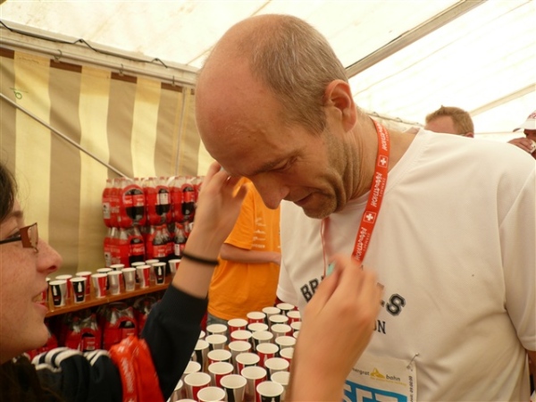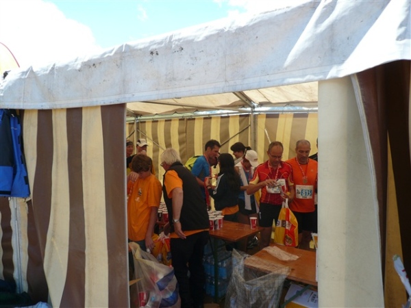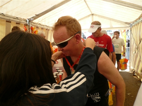 Schlangestehen zur Chiprückgabe, Huldigung der Fans entgegennehmen, vor Margot posen, nur noch genießen. Klasse war’s! Ich erhalte eine schöne Medaille, bekomme während des Wartens (!) schon eine Verpflegungstüte gebracht und bediene mich dann großzügig am Flüssigkeitsnachschub, denn der ist dringend notwendig, auch wenn ich unterwegs gut nachgefüllt habe. Stimmung wie bei der Jungfrau 2011: Sommer, Sonne, Heiterkeit, man kann im warmen Gras liegen und es sich gutgehen lassen.