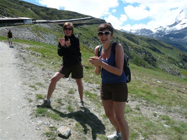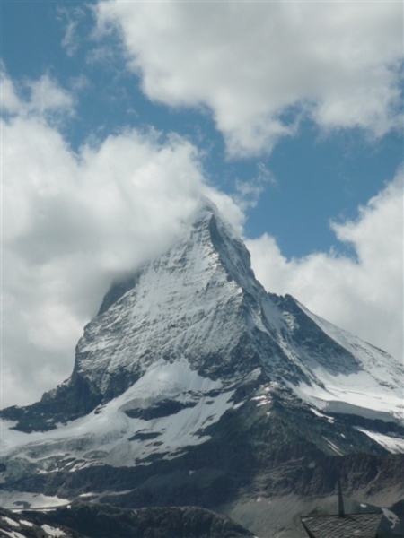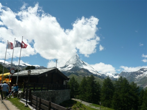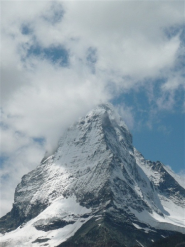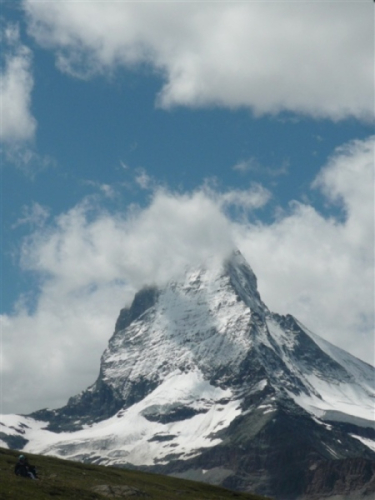 Und dann muß ich einfach mal stehenbleiben, zoomen und dem Berg der Berge den ihm gebührenden Tribut zollen. Was haben wir für ein Glück! Gestern bei der Streckenerkundung war es noch komplett nebelverhangen und nicht einmal zu erahnen gewesen, heute erstrahlt es in voller Schönheit, nur die Spitze von einem leichten Wolkenschleier umgeben. Bleibt es heute das Matterhorn oder wird es mir zum Marterhorn? So, wie es derzeit aussieht, darf es seinen Namen behalten, denn ich fühle mich trotz der Anstrengung gut und versuche, das grandiose Panorama in mir aufzusaugen, leider kann ich es ja nicht mit nach Hause nehmen.