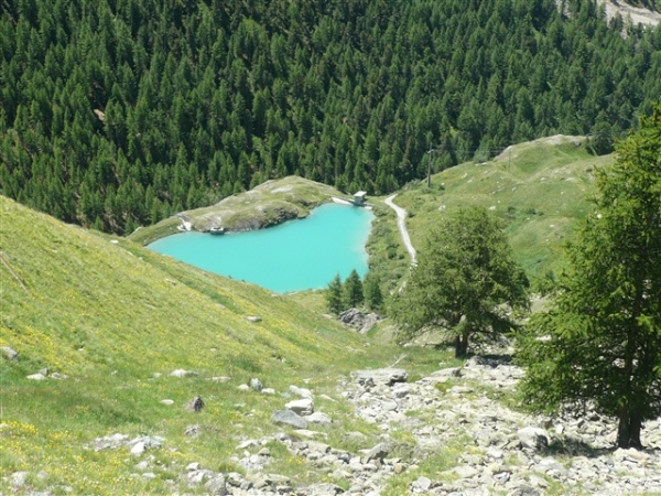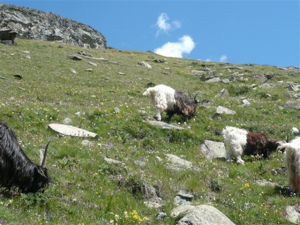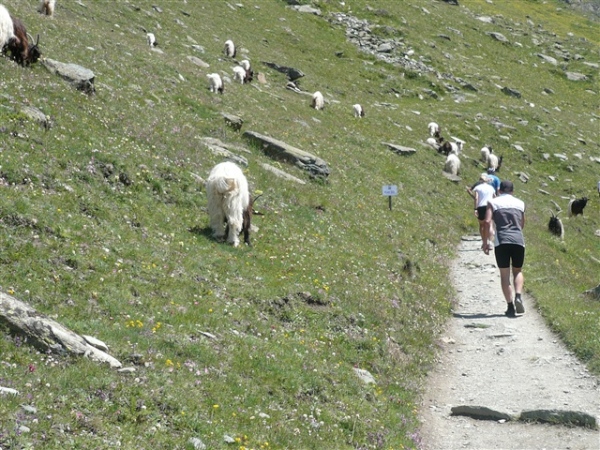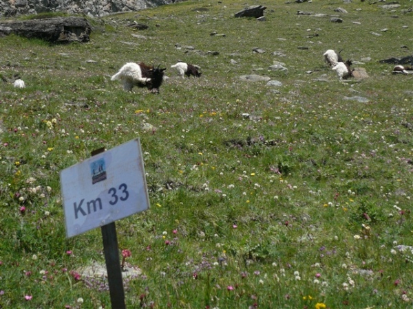 Den smaragdgrünen See unter mir könnte ich immerzu nur anschauen, muß aber auf den Weg achten, um nicht auf die Schnauze zu fallen. Dazu später mehr. Mühsam schleppt sich der Tross weiter, Km 33, Ziegen, friedliche, zum Glück. Der Weg wird zunehmend schwieriger, immer wieder muß ich dicken Steinen ausweichen, darf nicht umknicken. Die Japaner, nee, so etwas habe ich noch nicht gesehen. Das Matterhorn muß nach dem Fuji San der zweitheiligste Berg Japans sein, so viele von denen treiben sich hier herum. Dankbares Marathonpublikum, immer wieder stehen sie am Rand, strahlen und applaudieren mit behandschuhten Händen. Gibt es ein marathonverrückteres Volk als die? Andrea und Kay haben es vorgemacht, ich glaube, auch da muß ich noch hin. Eng ist der Weg, aber das ist hier kein Problem. Ganz im Gegensatz zur Jungfrau, so schön sie ist, so überlaufen ist sie auch, was unvermeidlich an manchen Stellen zu Staus führt. Klare Sache, hier und heute 812 Finisher plus 370 Staffelläufer sind schon etwas anderes als eine Jubiläums-Doppelveranstaltung am Samstag und Sonntag mit je 4.000 Gemeldeten!