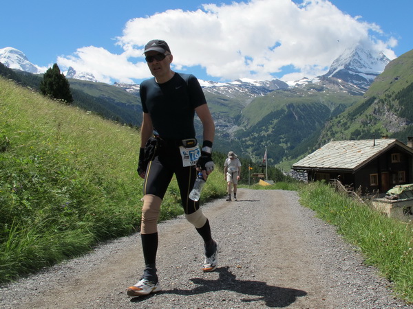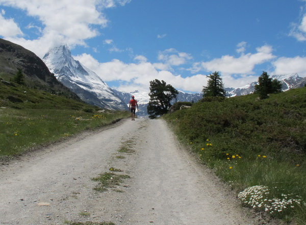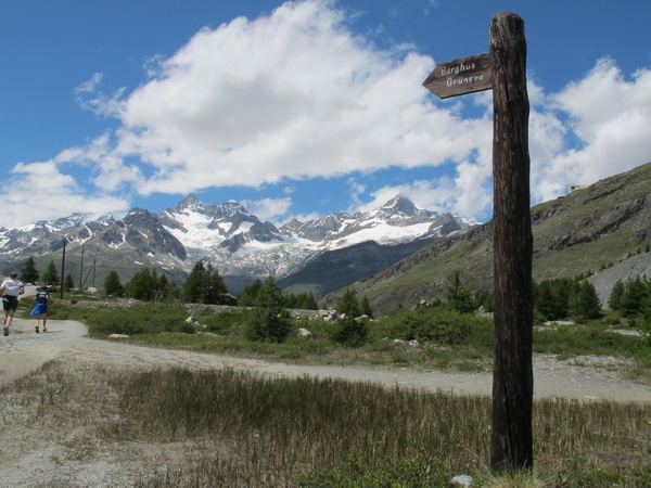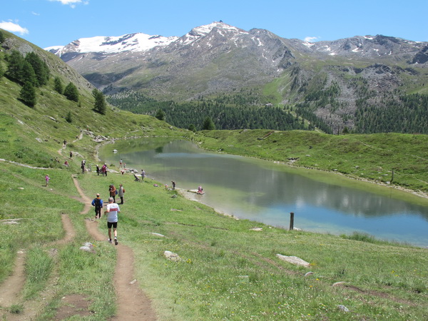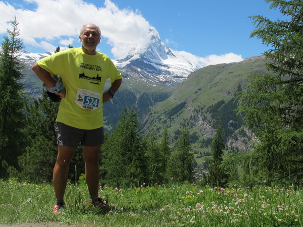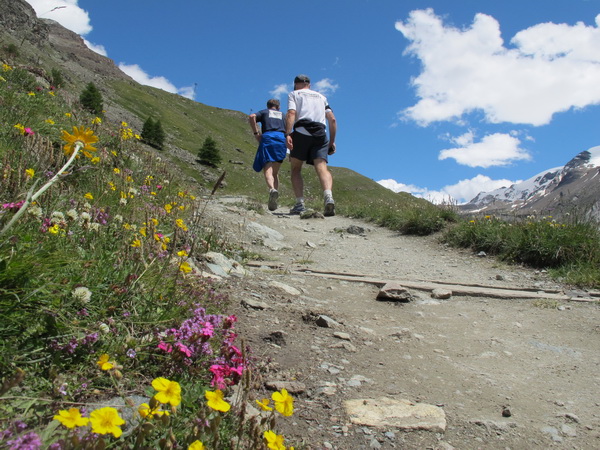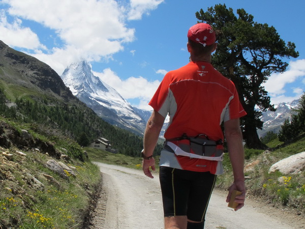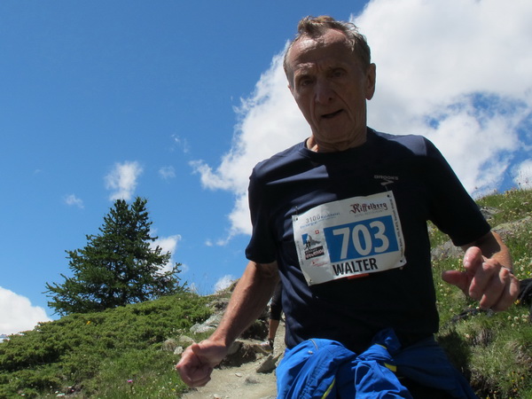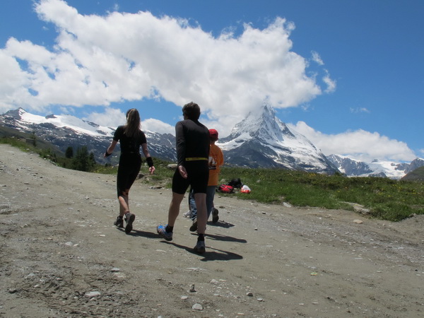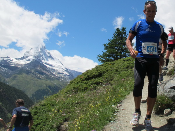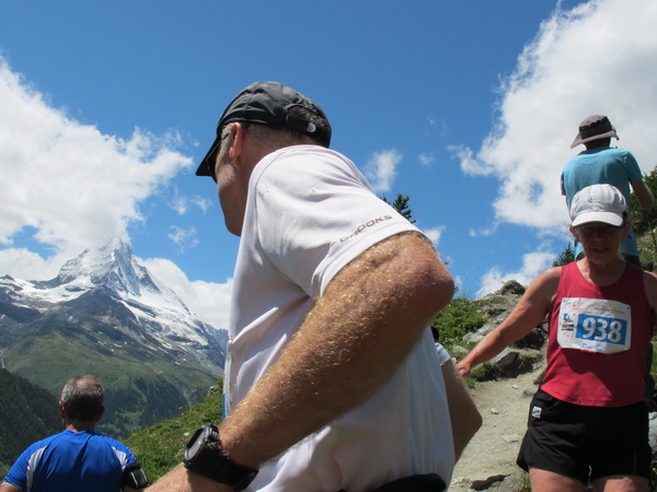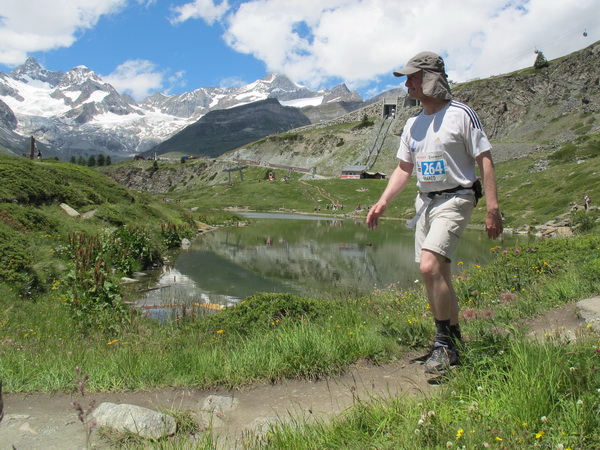 Je höher man steigt, umso grandioser werden die Ausblicke, vor allem auf das Matterhorn, das sich hier von seiner schönsten Seite zeigt. Leider halten sich hartnäckig ein paar Wolken. Nach knapp vier Kilometern erreichen wir dann Sunegga (2262 m – 32,5 km), eine phantastische Sonnen- und Aussichtsterrasse hoch über Zermatt. Wie immer, will ich hier nicht weiter. Es ist zu schön. Vor allem etwas unterhalb am Leisee, wo man die prachtvolle Bergwelt gleich doppelt sieht. Schmal ist auch der Pfad, auf dem es zunächst noch etwas abwärts, dann aber steil bergauf geht. Vor mir laufen Walter und David, zwei Amis. Walter machte letztes Jahr an seinem 75. Geburtstag den Chicago Marathon. So was erfährt man heutzutage mit einem einzigen Blick auf das Shirt des stolzen Läufers.