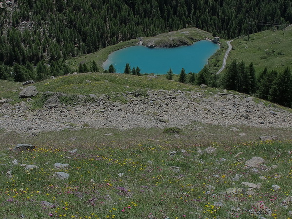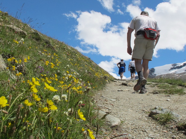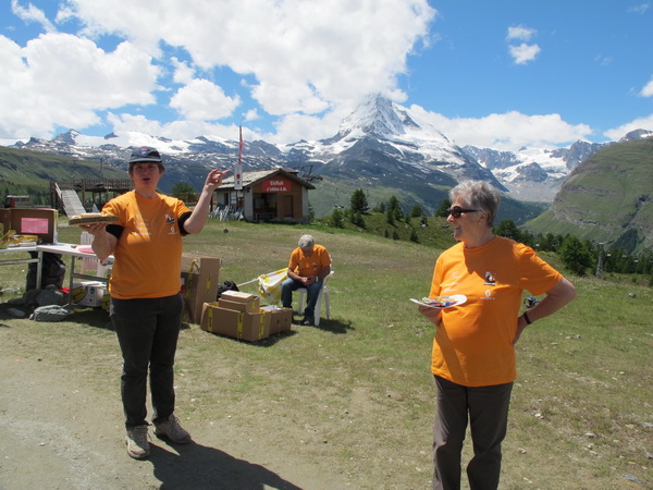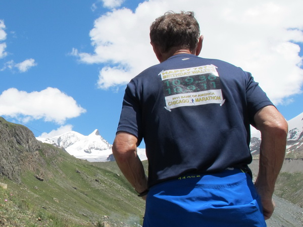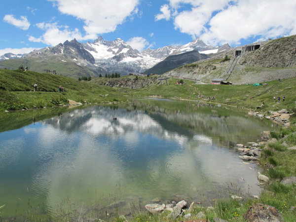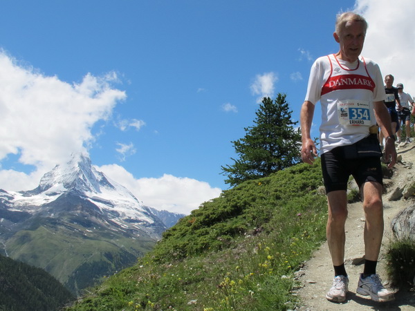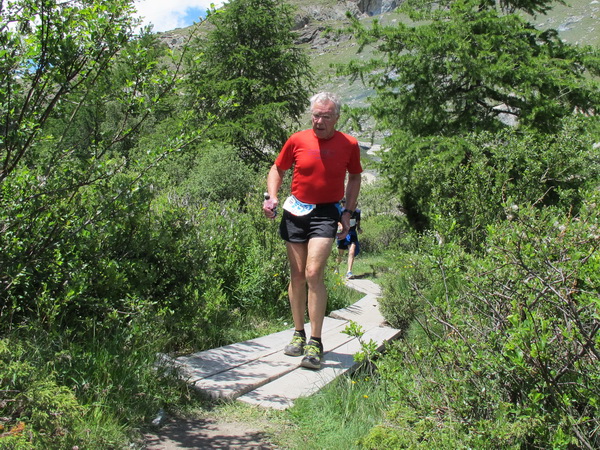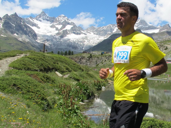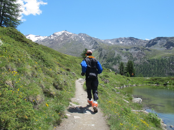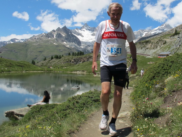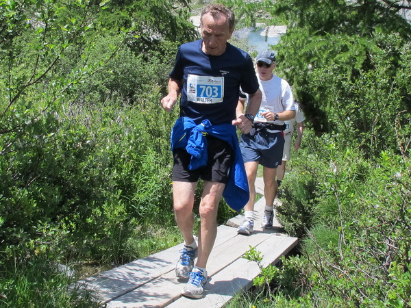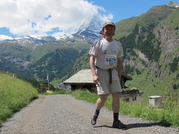 Je höher man steigt, umso grandioser werden die Ausblicke, vor allem auf das Matterhorn, das sich hier von seiner schönsten Seite zeigt. Leider halten sich hartnäckig ein paar Wolken. Nach knapp vier Kilometern erreichen wir dann Sunegga (2262 m – 32,5 km), eine phantastische Sonnen- und Aussichtsterrasse hoch über Zermatt. Wie immer, will ich hier nicht weiter. Es ist zu schön. Vor allem etwas unterhalb am Leisee, wo man die prachtvolle Bergwelt gleich doppelt sieht. Schmal ist auch der Pfad, auf dem es zunächst noch etwas abwärts, dann aber steil bergauf geht. Vor mir laufen Walter und David, zwei Amis. Walter machte letztes Jahr an seinem 75. Geburtstag den Chicago Marathon. So was erfährt man heutzutage mit einem einzigen Blick auf das Shirt des stolzen Läufers.