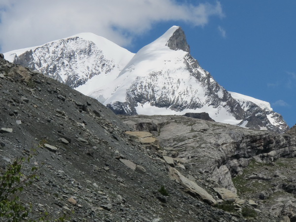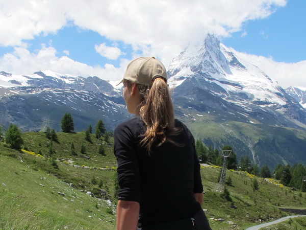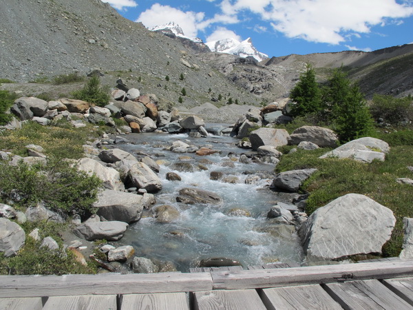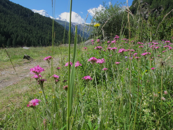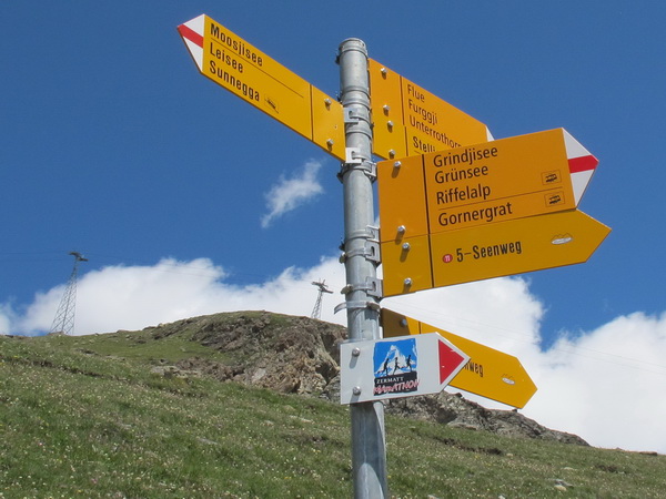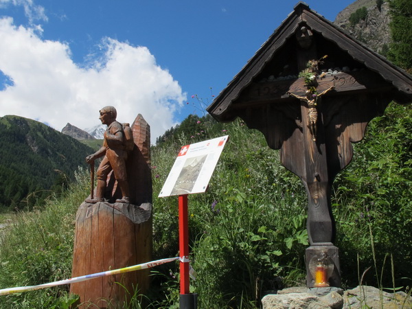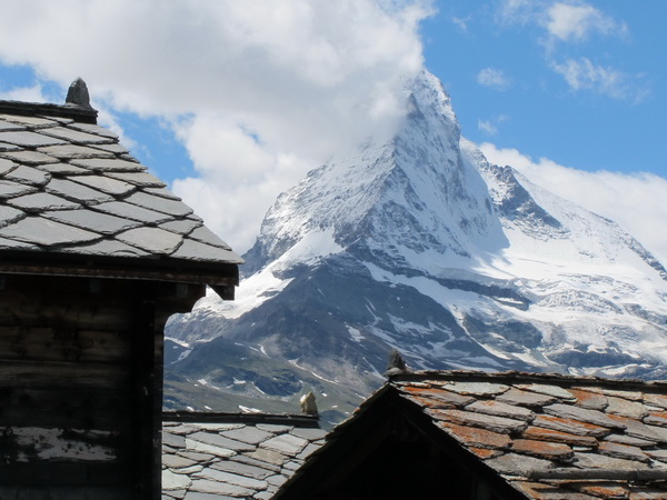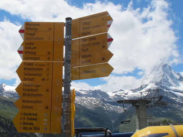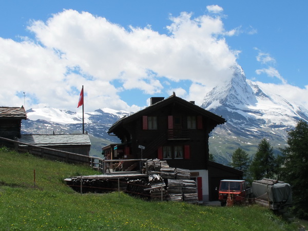 Weiter geht’s Richtung Täsch. Es riecht nach frisch gemähtem, würzigem Gras. Uralte Heuhütten aus schwarzem, verwittertem Holz stehen am Weg. In Täsch (1446 m – km 15,8) ist für den Autoverkehr Endstation. Fast 4000 Parkplätze stehen zur Verfügung. Alle 20 Minuten fahren Züge nach Zermatt. Nur 12 Minuten dauert die Fahrt, zu Fuß dauert’s deutlich länger. Hat man nämlich über den Hohsteg die Vispa gequert, wartet ein schmaler Pfad durch wechselndes Gelände auf uns. Von einer Anhöhe aus schaut man auf Zermatt. Zahlreiche Baukräne sprechen für eine anhaltend gute Konjunktur. Die weltberühmte Bergpyramide hält sich hinter dichten weißen Wolken verborgen. Schade, aber der Berg der Berge hat noch eine Chance. Der Tag ist noch lang.