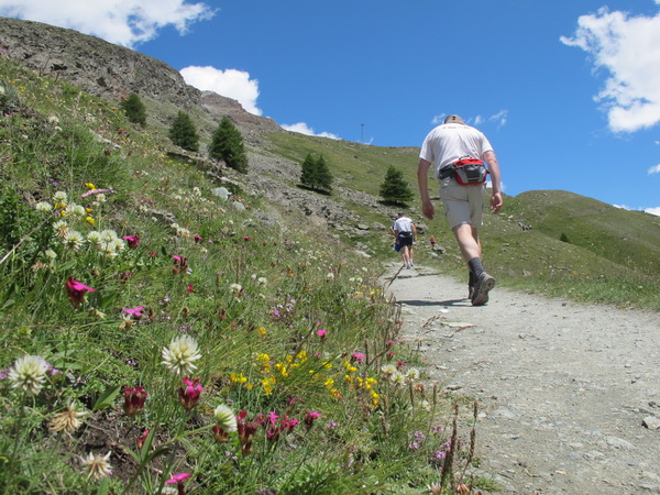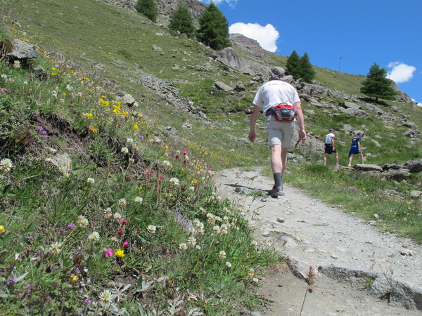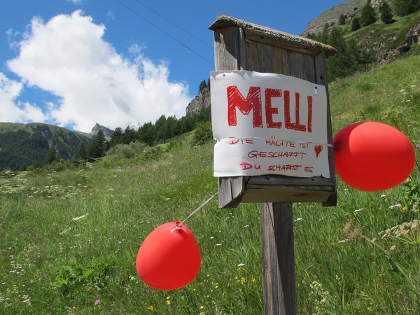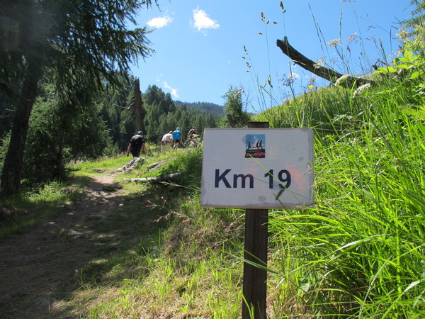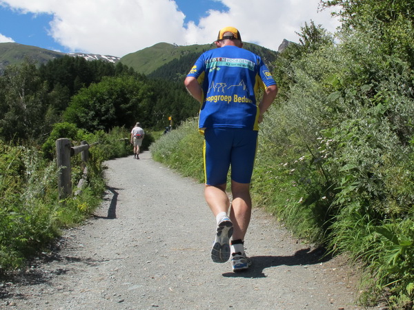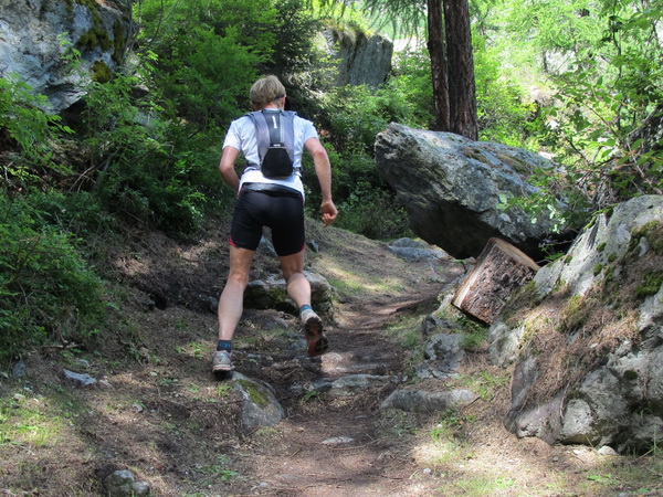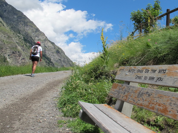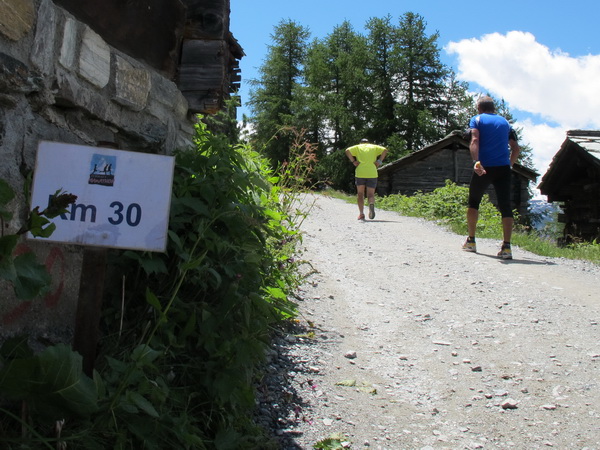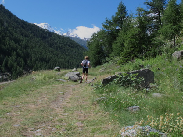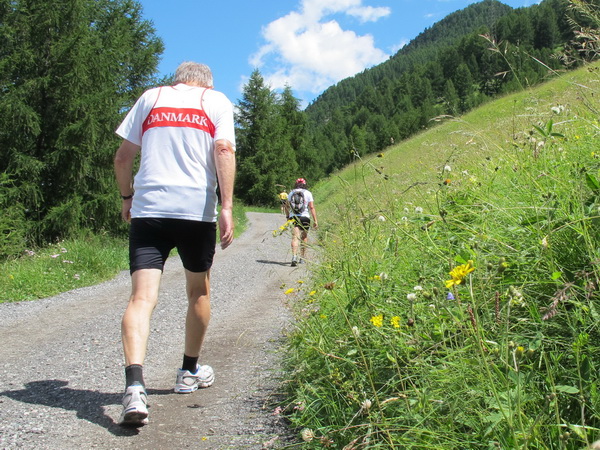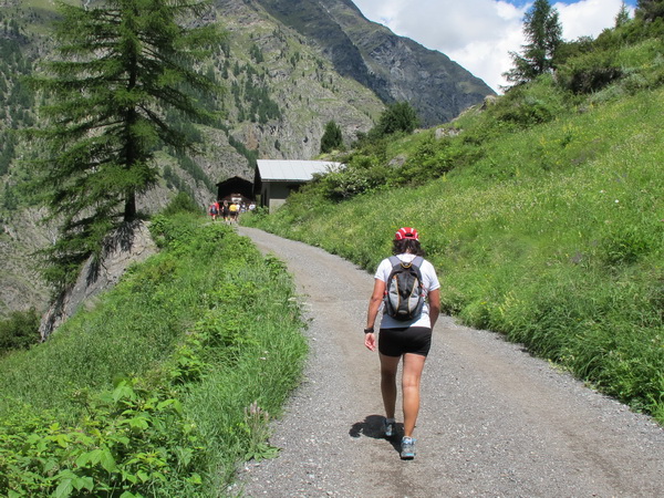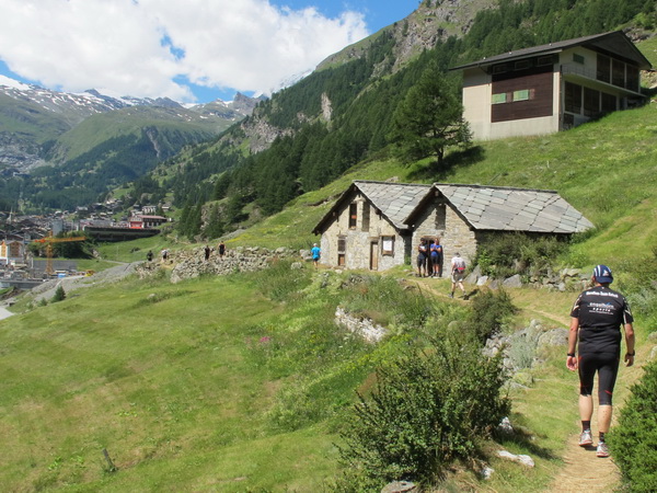 Wir laufen eine kurze Schleife Richtung Blatten, einer kleinen Almhüttensiedlung, und sind gleich wieder zurück im Ort, um den alpinen Teil der Strecke zu erledigen. Ehrlich gesagt bin ich froh darum. Die Lauferei bis hier hin hat mich ziemlich zermürbt. Jetzt kann ich ungeniert marschieren.
