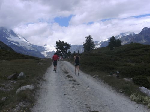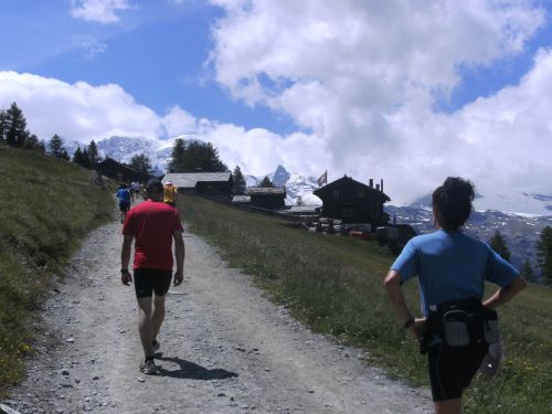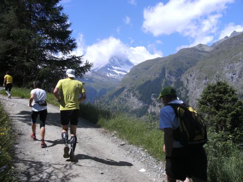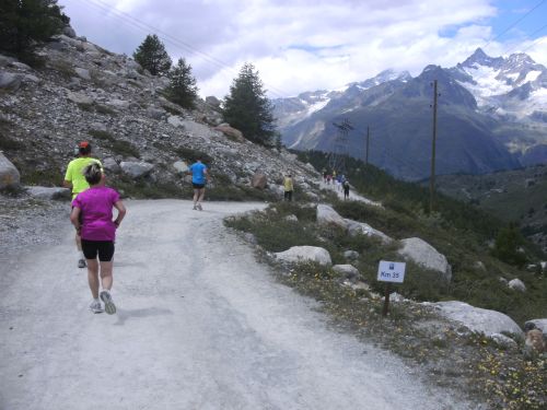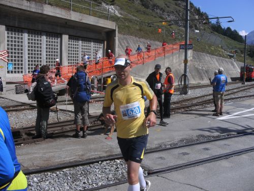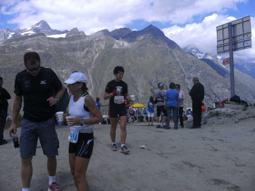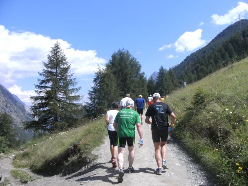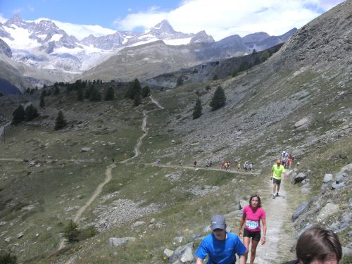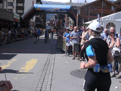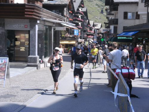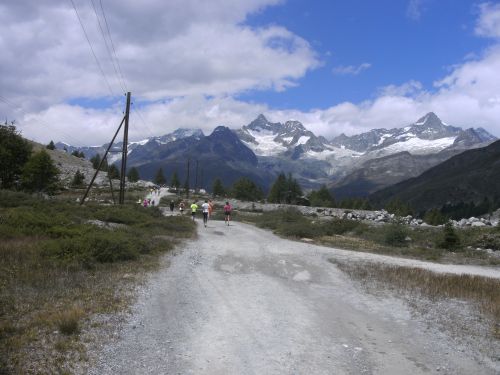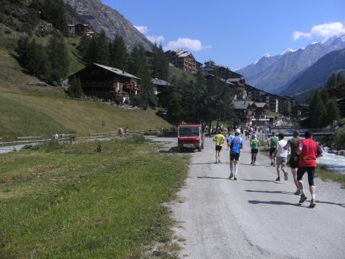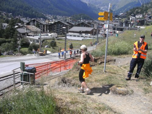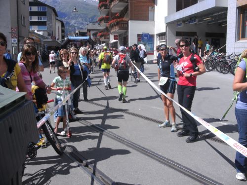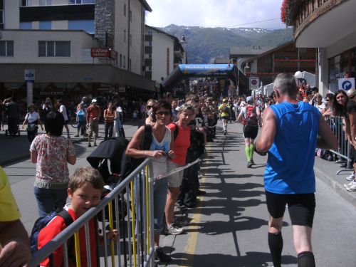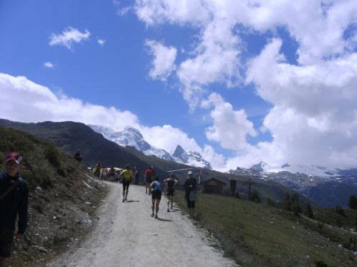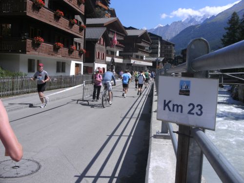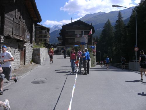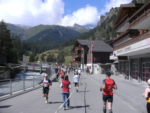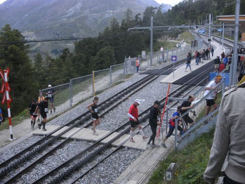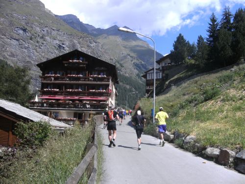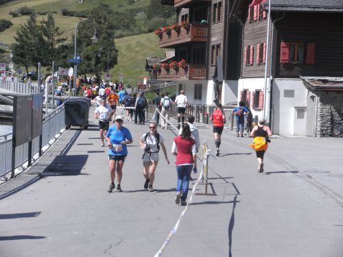 Das Läuferfeld ist mittlerweile bunt durcheinander gewürfelt. Viele später gestartete Marathonis haben sich unter die Ultras gemischt und zudem gab es in Zermatt am Bahnhof den Wechsel in der Marathonstaffel.