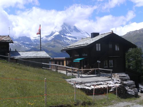 Der Untergrund wechselt immer wieder. Breite Waldwege/Fahrwege wechseln mit schmalen Pfaden ab. Zudem gibt es einige steinige Passagen zu überlaufen. Vorsicht ist angesagt. Wir laufen von Sunegga bis zum Talschluss und auf dem gegenüberliegenden Hang Richtung Riffelberg. An der Stelle, an der wir die Gleise der Gornergratbahn überqueren, beginnt die höchstgelegene Straßenbahn Europas. Auf mehreren hundert Metern Länge fährt eine Straßenbahn zur Riffelalp. Hier wurde bereits 1884 auf 2.222m Höhe ein Hotel eröffnet. Mittlerweile ist ein Neubau hinzugekommen. Unverändert schön ist der freie Blick auf das Matterhorn, das sich leider immer noch mit Wolken umhüllt.