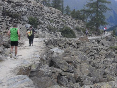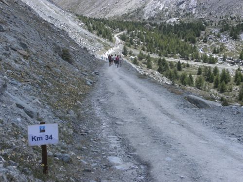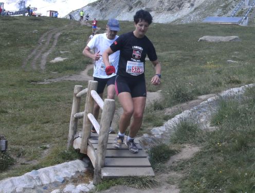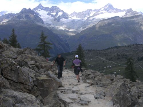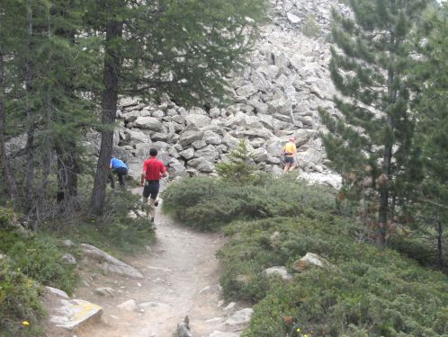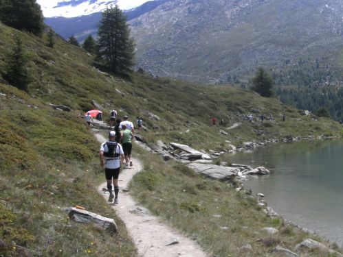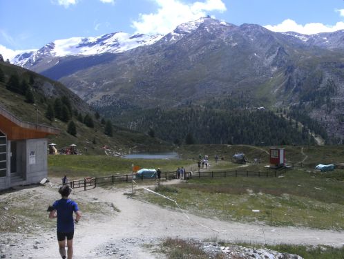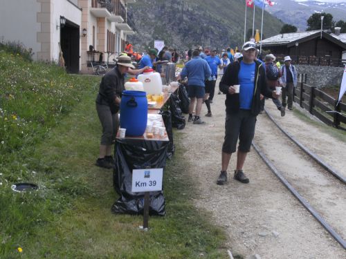 Vor dem Hotel ist exakt bei KM 39 eine Verpflegungsstelle, an der ich gerne wieder ausgiebig zugreife. Wie am Kirchplatz in Zermatt spielt auch auf der Riffelalp eine Musikgruppe. Ich kanns nicht lassen und haue auf die Trommel was das Zeug hält. Dann wird es wieder Ernst. Ich habe den nun folgenden Abschnitt noch von der Premiere 2002 in böser Erinnerung. Es wird wieder richtig anstrengend.