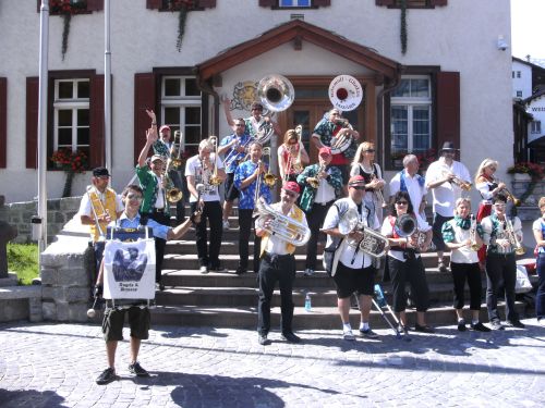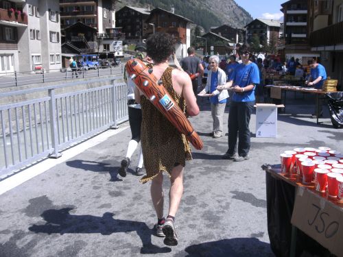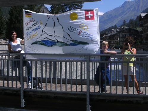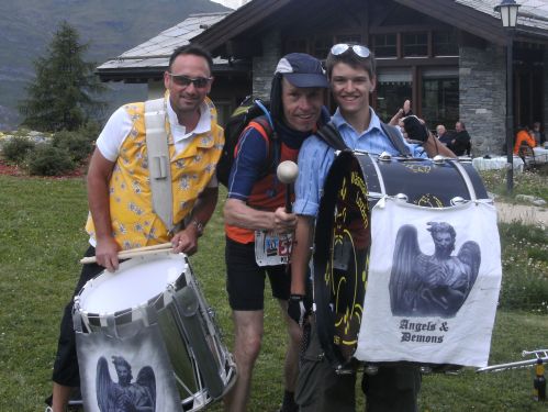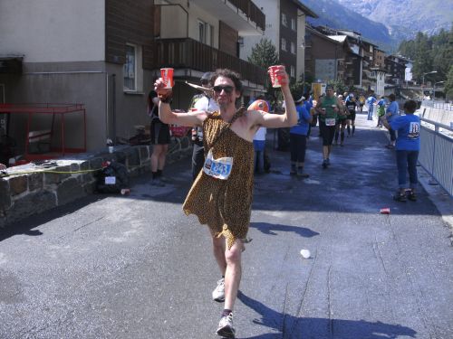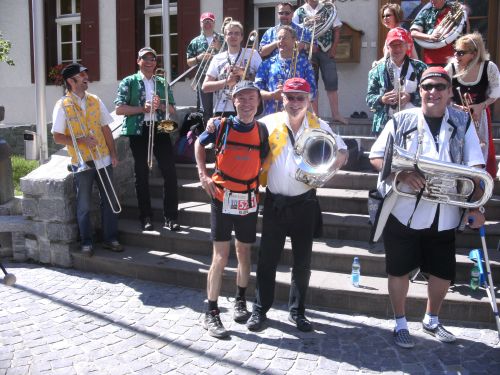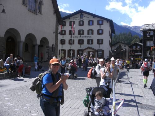 In Zermatt queren wir vor dem Bahnhof den Bahntunnel und laufen auf der Hauptstraße durch den Ort. Hier ist die Halbmarathonmarke erreicht. Die Zuschauer stehen dichtgedrängt und es herrscht Stimmung. An der Kirche spielt eine Musikgruppe. Als sie Pause machen, mische ich mich unter die Musiker. Lachend machen sie den Spaß mit.