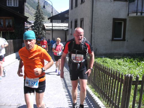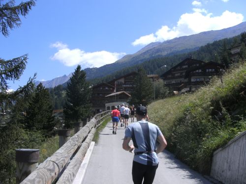 An einer Steigung in Zermatt treffe ich Jens. Wie er laufe ich weiter durch Zermatt. Wir sehen die Läufer von der Wende knapp außerhalb des Ortes uns entgegen kommen. Wir queren die Matter und laufen parallel zum Wasser durch den Ort.