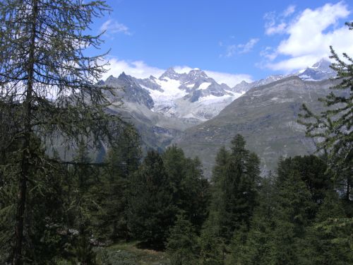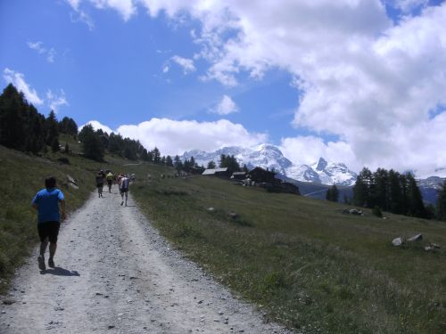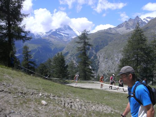 Nun ist Schluss mit lustig. Der eigentliche Aufstieg beginnt. Es geht hinauf zur Sunegga. Schon bei den letzten Häusern Zermatts beginnt der kilometerlange Aufstieg, der mich rasch in den Gehschritt fallen lässt. Zunächst laufen wir noch auf Asphalt, bald aber auf Waldwegen. Der Schatten im Wald ist willkommen, ist es doch in der Sonne ordentlich warm. Dafür lässt uns die Sonne und der blaue Himmel die umliegenden Berge wie das Breithorn oder das Kleine Matterhorn in voller Schönheit erscheinen. Was gibt es schöneres als mit Blick auf Berge und blauen Himmel dem selbigen entgegen zu laufen?