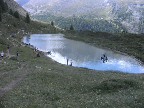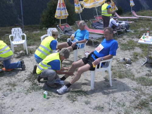 Genau zur rechten Zeit dürfen wir einige Kilometer abwärts bzw. nahezu eben laufen. Eine Wohltat für die geschundenen Knochen. Wir laufen an einem kleinem See vorbei. Herrlich, wie sich die schneebedeckten Berge im Wasser spiegeln, was will man mehr. Richtig, eine Massage und gute Verpflegung. Gibt es alles. Ich sehe unterwegs mehrere Massagestellen. Die Verpflegung mit Wasser, Iso, Tee, später Cola und Bouillon als Getränke und Riegel, Gels, Banane an Essbarem war ausgezeichnet und wurde von freundlichen Helfern angeboten. Überhaupt die Helfer. Erste Sahne was sie hier leisten. Dank an Euch alle. Ohne Euch und Euren Einsatz wären solche tollen Veranstaltungen nicht möglich.