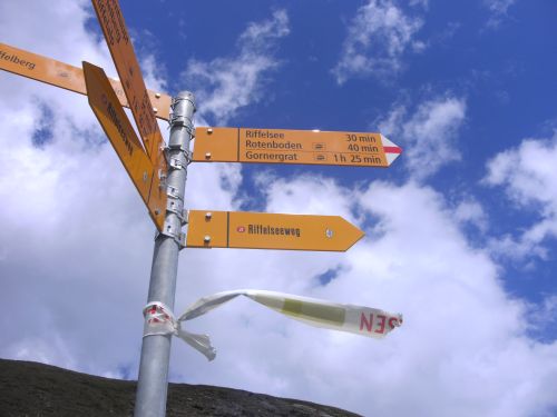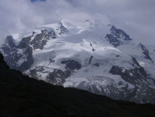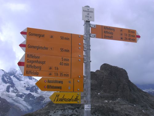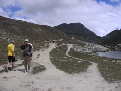 Uns kommen hier oben einige Wanderer und sogar Mountainbiker entgegen. Besonders die vielen Japaner feuern uns begeistert an. Danke, das tut gut und spornt an. Weniger anspornend ist das Wetter. Die Sonne ist schon eine Weile weg und die Gipfel der umliegenden Viertausender sind Wolken umhüllt. Das Matterhorn schickt uns zudem einen Hagelschauer vorbei. Macht nix, ich ziehe meine Regenjacke aus dem Trinkrucksack und bin gut gegen Hagel, Wind und Kälte geschützt.