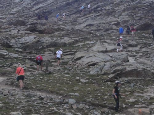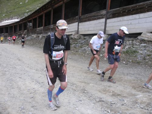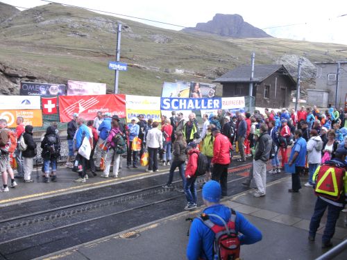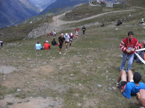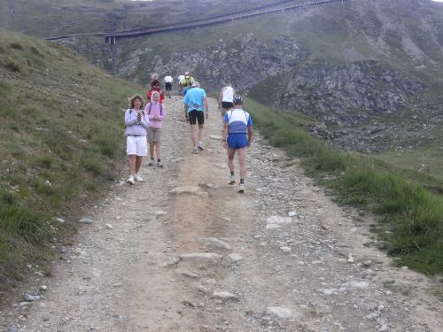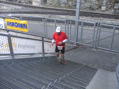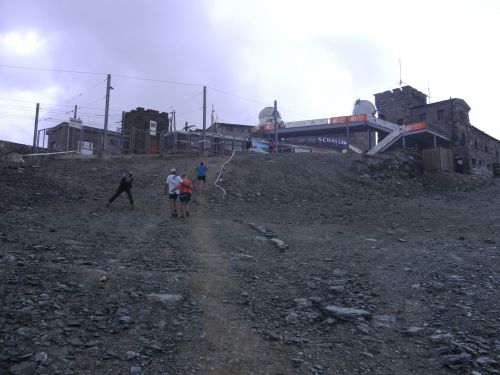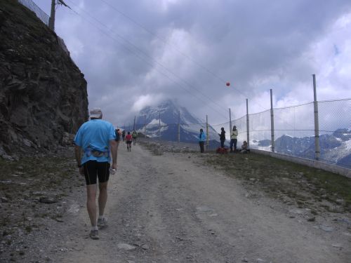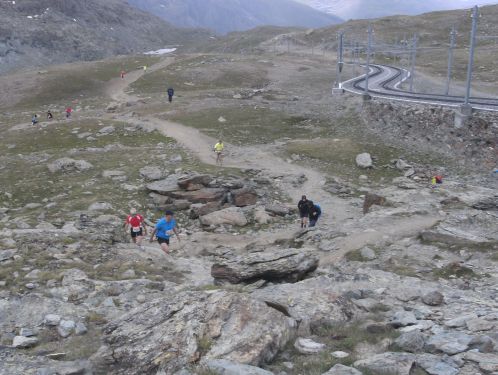 Zu meinem Ultraglück fehlt mir noch ein Verpflegungsbeutel, meine Wechselkleidung im schönen Kleiderbeutel aus dem Starterbeutel und eine warme Dusche. Ersteres erhalte ich nach dem Shirt. Um zweites zu erhalten und drittes tun zu können, muss ich die in kurzen Abständen fahrende Gornergratbahn hinunter nach Riffelberg nehmen. Auf der Fahrt hinunter vom Gornergrat kann ich noch einmal in Ruhe den Schlussteil der Laufstrecke betrachten. Da sehe ich Jens am "Hillary-Step". Tapfer kämpft er sich nach oben und wird seinen zweiten Ultra erfolgreich beenden. Ich ziehe das Fenster hinunter und feuere ihn lautstark an.