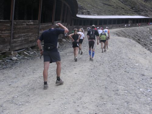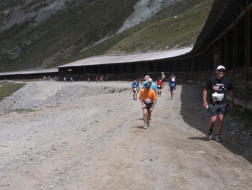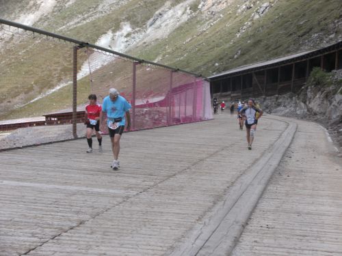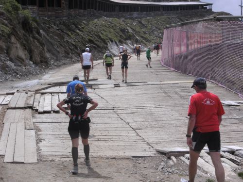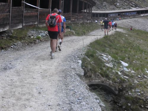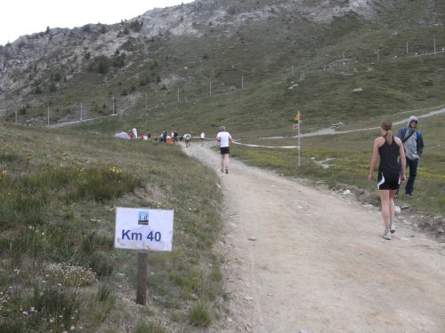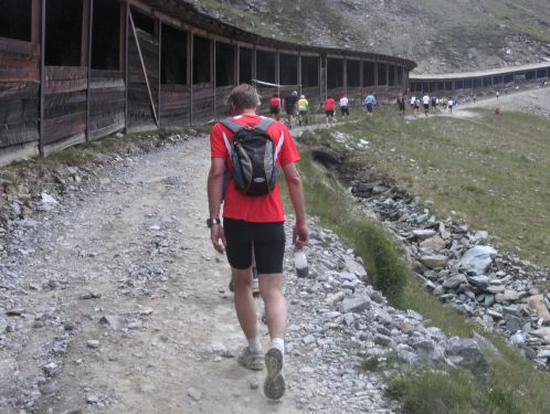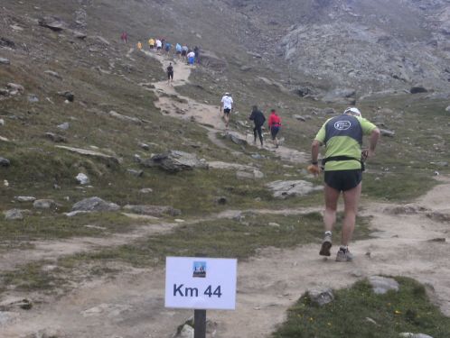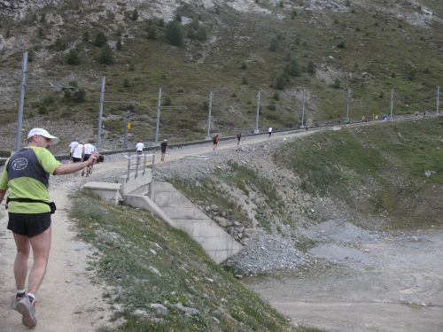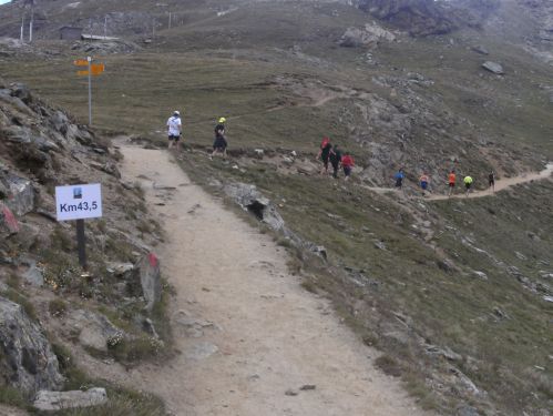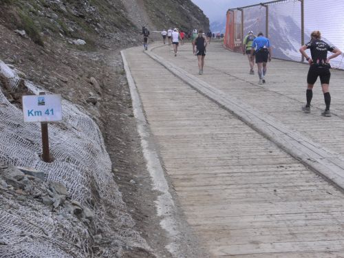 Ein Blick nach oben zeigt mir den persönlich als härtesten Teil des Laufes empfundenen Abschnitt. Es gilt zunächst zu den Gleisen der Gornetgratbahn zu laufen. Diese werden bei KM 40 erreicht. Schon dieser Kilometer hat es in sich. Nun aber geht es parallel zur Bahn in ihrem Lawinenschutztunnel heftig aufwärts. Dazu ist der schottrige Untergrund auch nicht gerade läuferfreundlich.
