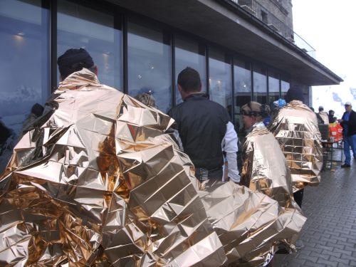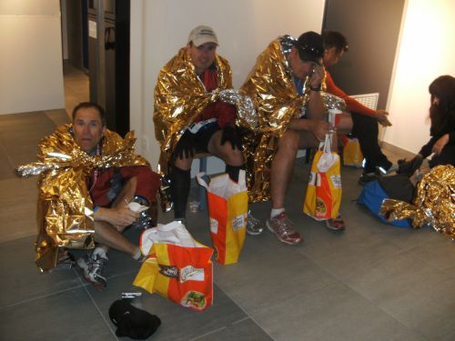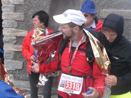 Schon Meter vor dem Ziel sehe ich goldene Gestalten hinter dem Zielbanner. Jeder Läufer erhält nach Überqueren der Ziellinie eine goldenfarbene Wärmefolie. Ich will auch so eine und laufe durchs Ziel. Ich freue mich über die persönliche Gratulation und die Ultra-Medaille. Der Chip wird mir abgenommen und ich erhalte mein Finisher-Shirt. Es gibt nur noch Größe 3X-L. Diese Kleidergröße ist meinen 60 Kg Lebendgewicht normalerweise nicht angemessen, hier jedoch absolut passend. Die Shirts fallen minmal aus und mir werden im Nachhinein einige tragische Fälle bekannt, bei denen M nicht groß genug ist. Körperbetonte Leibchen haben halt für manche Träger den Nachteil nix zu verschleiern. Jedes Pölsterchen wird sichtbar.