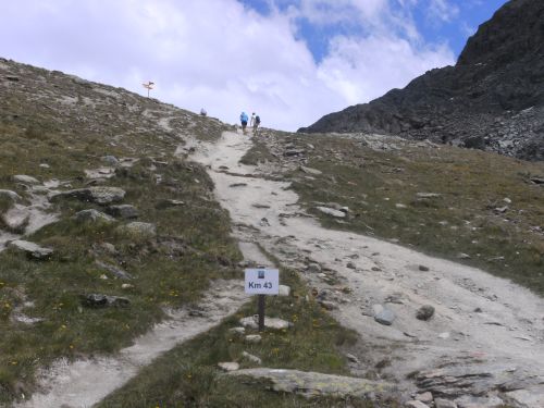 Auf den Bohlen passieren wir KM 41. Voraus liegt der Gipfel des Matterhorns – unverändert in Wolken gehüllt. Gottlob hatten wir es bei unseren Wanderungen Tage zuvor in schönster Sonne ohne Wolken gesehen.