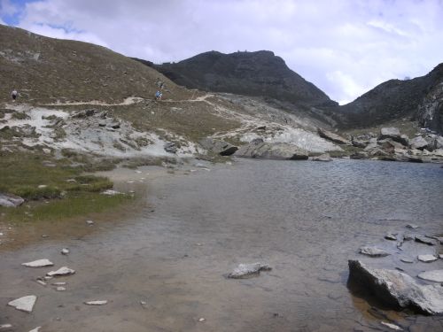 Gerne würde auch ich nach links zum Riffelberg laufen, aber ich halte durch und strebe dem Ziel des Ultras entgegen. Weitere 514 Höhenmeter auf 3,5 KM Länge warten noch auf die Ultras. Ich bin verwundert, dass es immer wieder einige Passagen gibt auf denen gelaufen werden kann. Ich bin hier zwar schon 2002 bei der Premiere gelaufen, da lag aber alles im Nebel unter Neuschnee, die Sicht war gleich Null. Nun sehe ich erstmals, wo ich schon 2002 lief. Kleine Seen liegen an der Strecke.