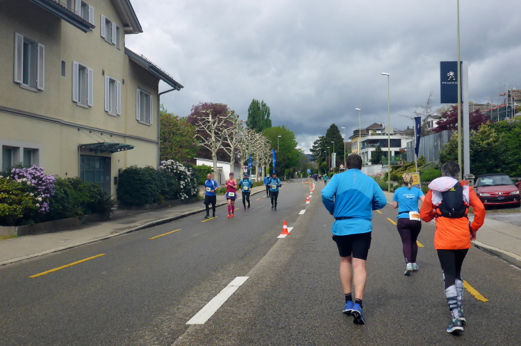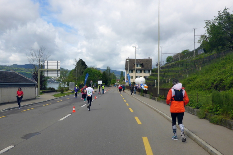 In Küsnacht kommt mir ein schwarzer Jaguar F-Pace entgegen. Ihm folgen die beiden Führenden in einem Tempo, von dem ich nur träumen kann. In immer kürzer werdenden Abständen folgen weitere Läufer. Ich bewundere ihren lockeren Laufstil, der mit meinem so rein gar nichts zu tun hat. Aber ich bin zufrieden. Ich nähere mich der Halbmarathonmarke, bin immer noch frisch und habe nach Erlenbach und Winkel bereits die Hälfte geschafft. Nur noch vier Kilometer und ich darf wenden.