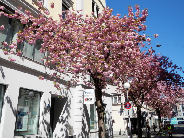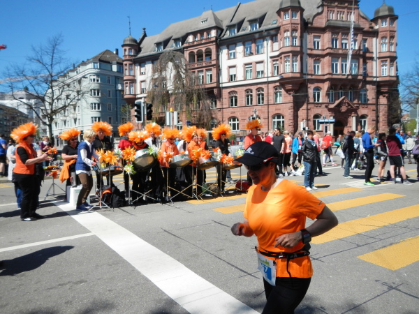 Ich bin wieder auf dem Punkt, dass ich laufe, genieße und mir kaum Gedanken über zurückgelegte oder noch zu bewältigende Kilometer mache. Sonne, frische Luft, üppige Blütenpracht an Bäumen und in Vorgärten, dazwischen Aufmunterung von Zuschauern mit Herz für Langsamere und musikalische Unterstützung. Es gelingt mir gar nicht, mir sie und ihre Standorte zu merken, ich bin im Flow.