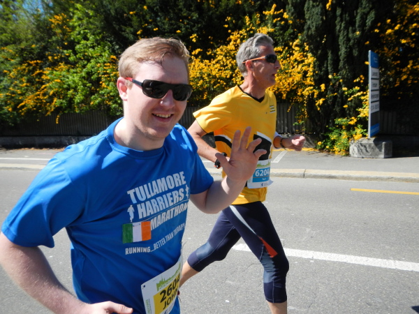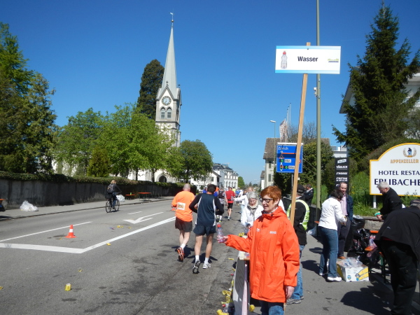 Kurz vor dem Strandbad dann die neuerliche Wende und zurück bei Start und Ziel vorbei auf die nächsten Dreiviertel der Strecke. Noch ist kein Kilometer vorbei, da treffe ich schon auf mein nächstes „Opfer“. Der niederländische Clubaufdruck auf den T-Shirts verrät, dass ich es bei dem Paar vor mir mit holländischen Lauffreunden zu tun habe. Zumindest teilweise. Sie kommt ursprünglich aus dem Glarnerland und verbindet Verwandtenbesuch und Marathon. Ein guter Vorwand und eine gerne angewandte Kombination zugleich.