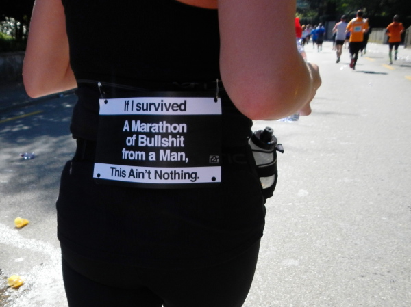 Eine Aussage in Form einer Startnummer am Rücken angebracht, weckt meine Neugierde: „If I survived a marathon of bullshit from a man, this ain’t nothing.“ Zu Deutsch: „Wenn ich einen Marathon von Sch… eines Mannes überlebt habe, dann ist dies gar nichts.“ Alayna aus Boston und ich unterhalten uns über mehrere Kilometer und ich wünsche ihr viel Glück zu ihrer Neupositionierung im Leben, zu welchem auch dieser erste Marathon gehört.