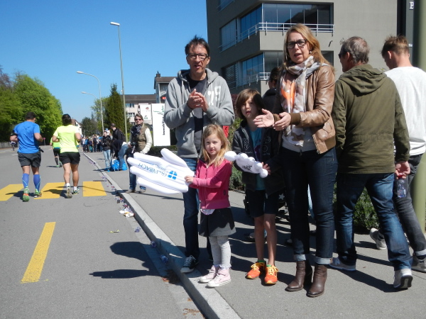Bei der Abzweigung in die Bahnhofstrasse hinein treffe ich wieder auf Tobias, der dort von seiner Schwester mit Anhang angefeuert wird. Leider verwackle ich die Aufnahme der Beiden. Ich bin wohl noch etwas zittrig nach meinem Sturz.